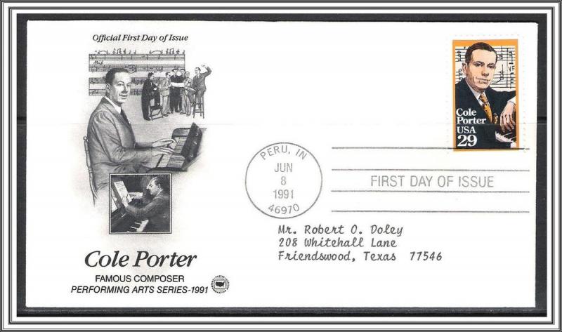 Welcome! United States - First Day Cover Catalogue #: 2550 Cachet: Art Craft Date: June 8, 1991 City/State: Peru, IN Description: 29c Cole Porter Condition: VG - Clean, Addressed Keywords: atcft ... Read More