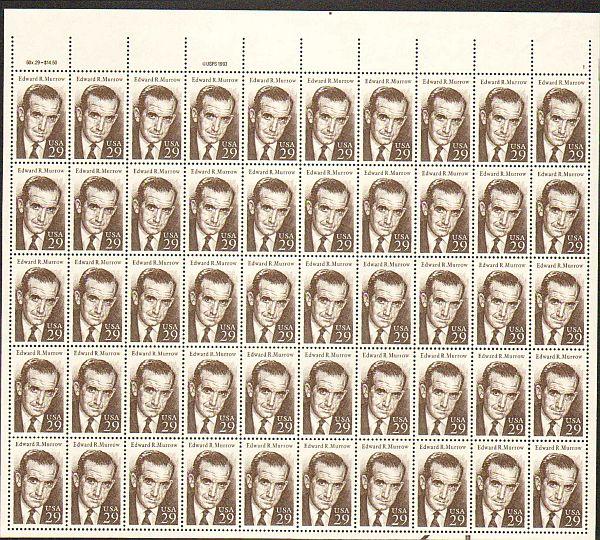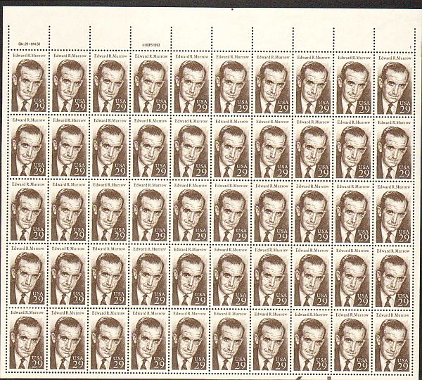 US #2812 Mint Sheet Edward R Murrow The image shown may not be the actual sheet you receive. Sheets will not be folded. Minor perf separations in the selvedge are normal and are not grounds for return. Centering w ... Read More