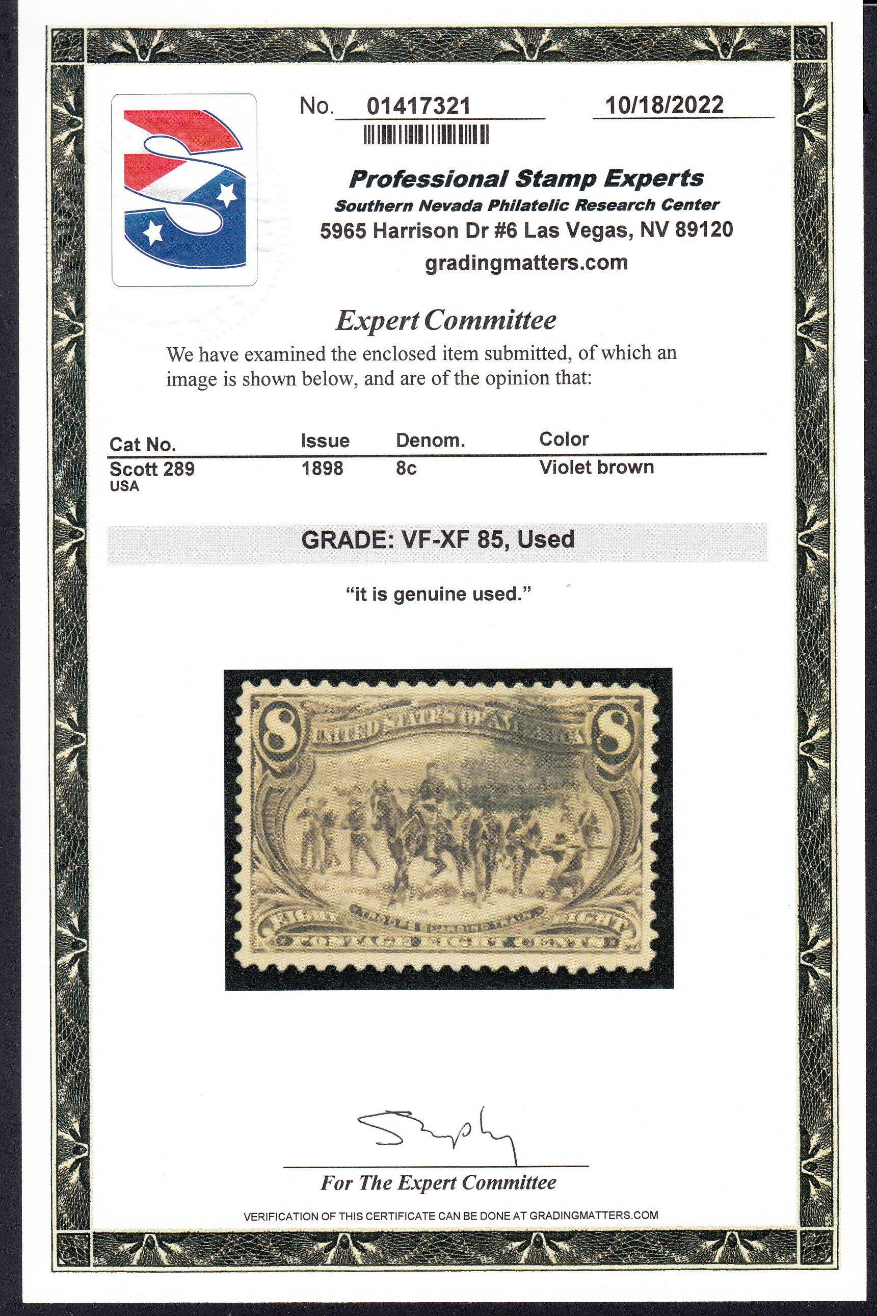 US #289 Used, PSE 85 Cert. Buyer to pay $5.00 postage. Longtime 30+ year APS member.