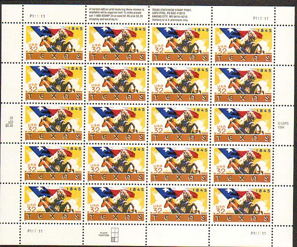US #2968 Mint Sheet Texas Statehood The image shown may not be the actual sheet you receive. Sheets will not be folded. Minor perf separations in the selvedge are normal and are not grounds for return. Centering w ... Read More