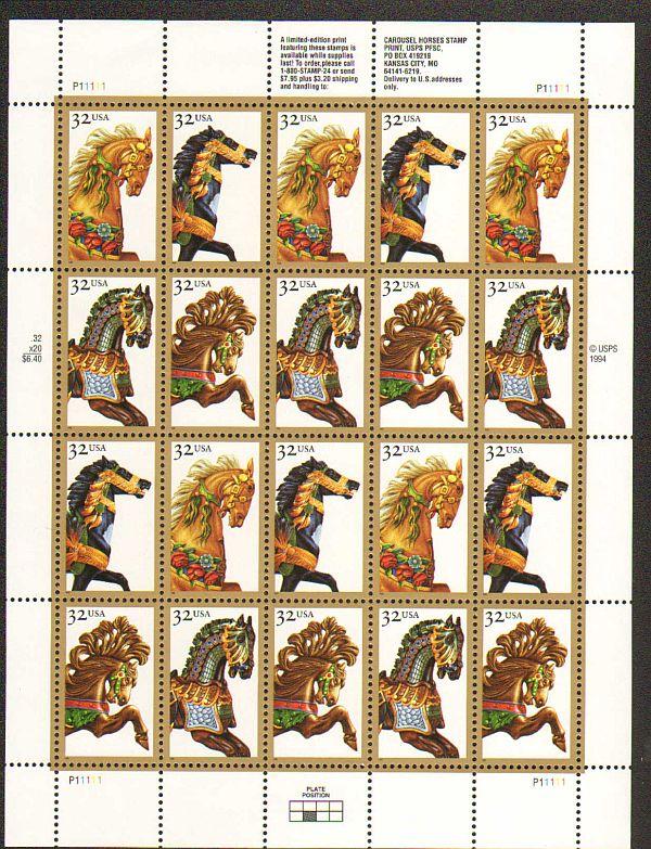 US #2976-79 Mint Sheet Carousel Horses The image shown may not be the actual sheet you receive. Sheets will not be folded. Minor perf separations in the selvedge are normal and are not grounds for return. Centerin ... Read More