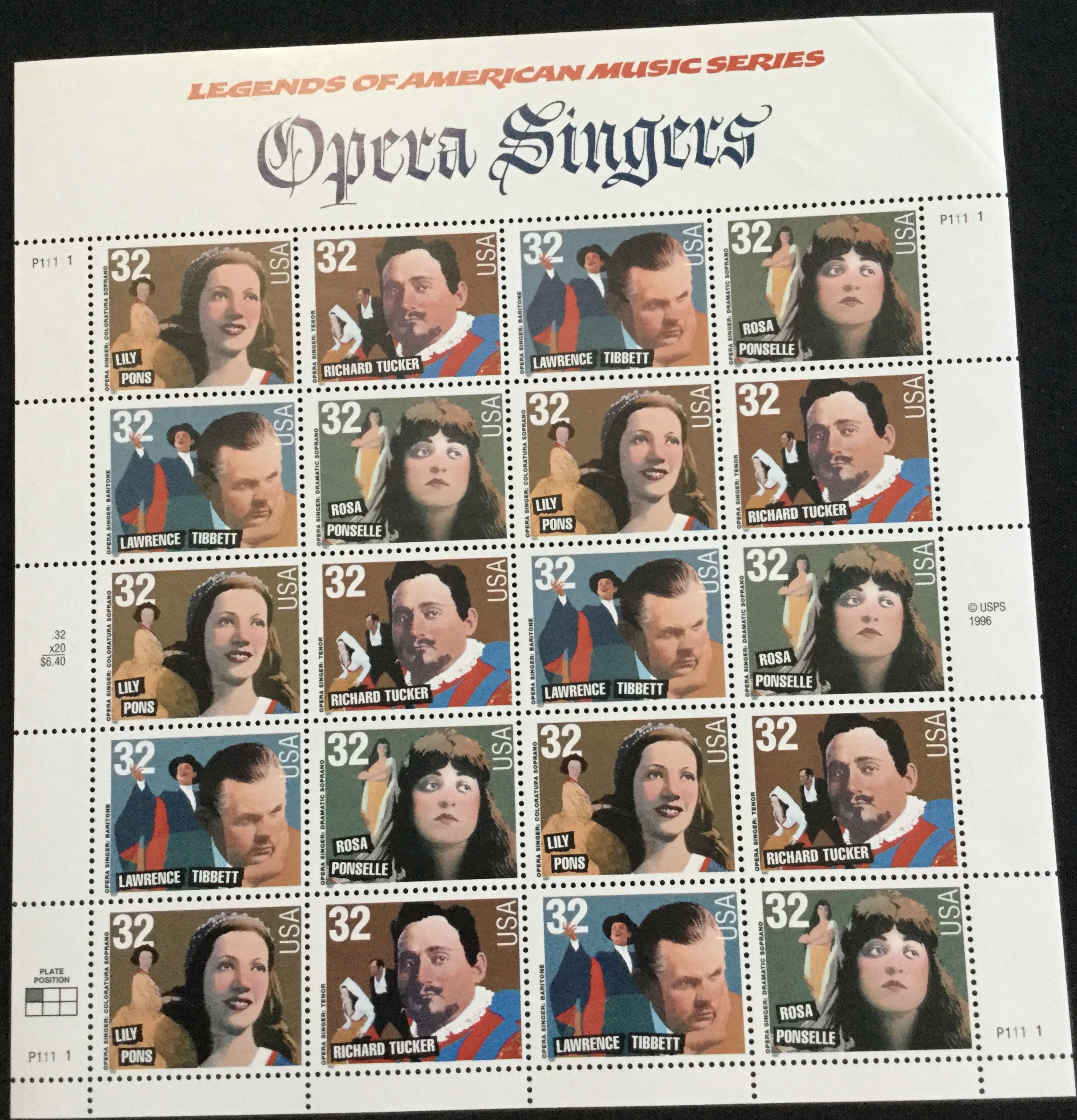 US #3154-3157 (3157a) MNH Sheet of 20 CC Opera Singers SCV $15.00 L24