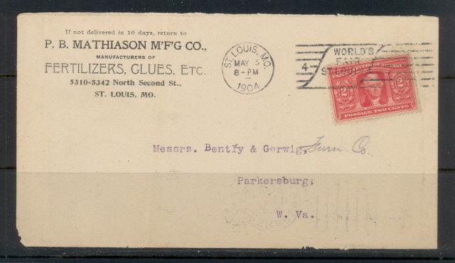 Us 324 on 1904 fertilizers glues advertising corner cover --- st. Louis, mo. May 3 1904 (missouri) circular dated postmark with world's fair st. Louis slogan cancel tying stamp to cover --- if not delivered in 10 days, return to p. B. Mathiason manufacturers of fertilizers, glues, etc., north second street, saint louis, missouri --- addressed to messrs. Bently gerwis, furn co, parkersburg, west virginia --- postmark repeated on backParkersburg may 4 1904 west virginia circular dated back stamp with vertical machine bars --- stamp has a few nibbled perfs at right --- slight soiling --- small damaged spots at bottom edge and lower left corner (from front) --- vertical crease at right (from front) --- cover slit open at top;