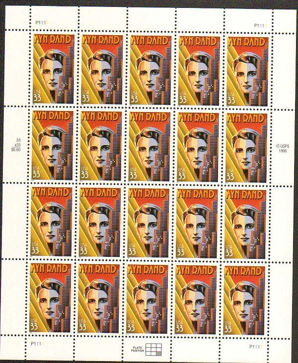 US #3308 Mint Sheet Ayn Rand Author The image shown may not be the actual sheet you receive. Sheets will not be folded. Minor perf separations in the selvedge are normal and are not grounds for return. Centering w ... Read More