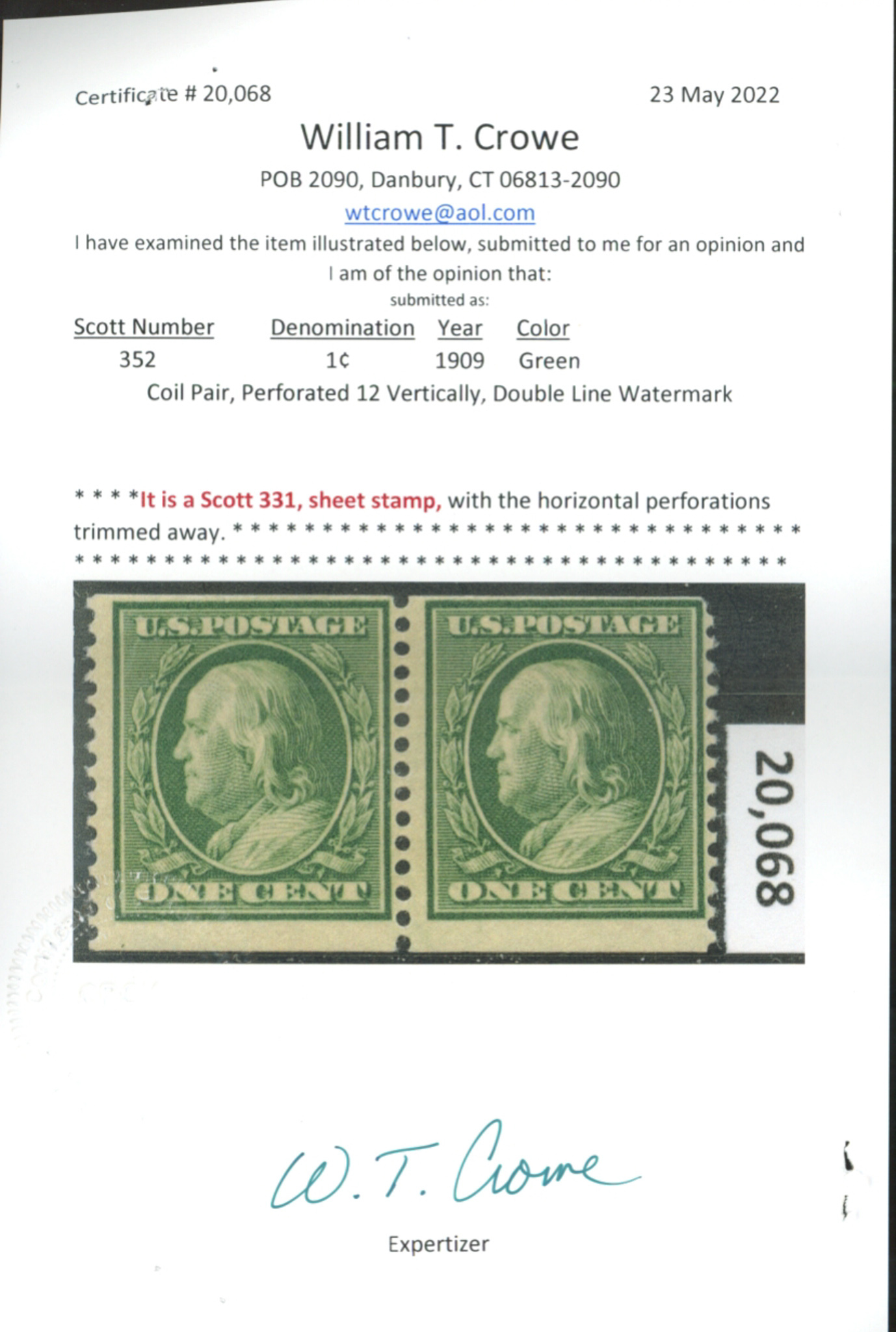U.S. #331 MINT PAIR WITH CROWE CERTSeller Information