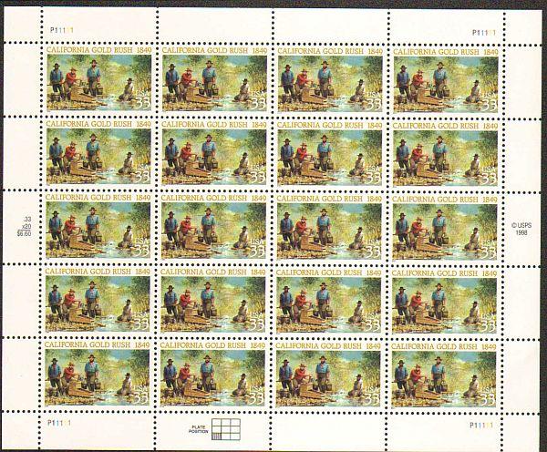 US #3316 Mint Sheet CA Gold Rush The image shown may not be the actual sheet you receive. Sheets will not be folded. Minor perf separations in the selvedge are normal and are not grounds for return. Centering will ... Read More