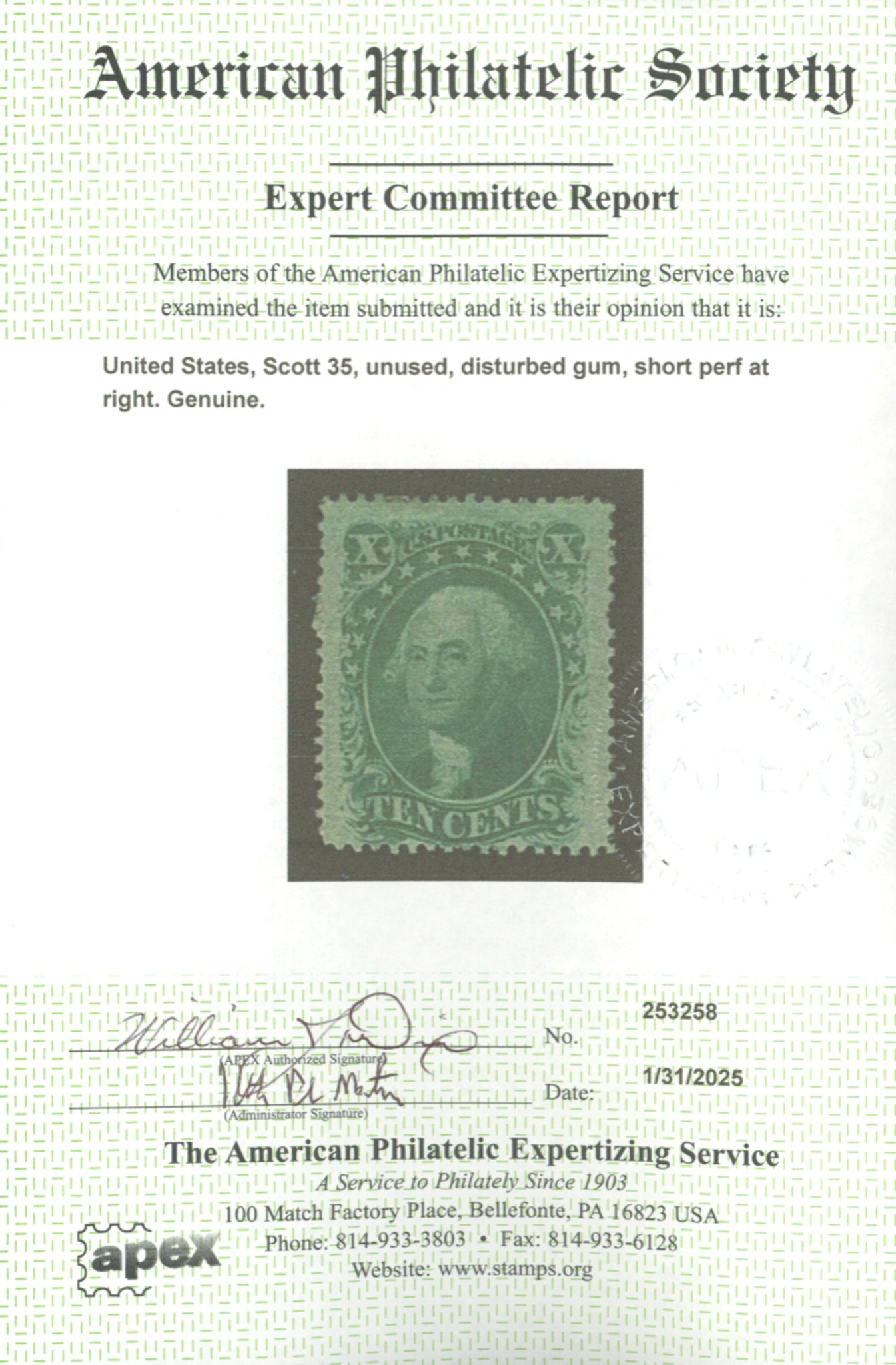 U.S. #35 UNUSED WITH APS CERTSeller Information