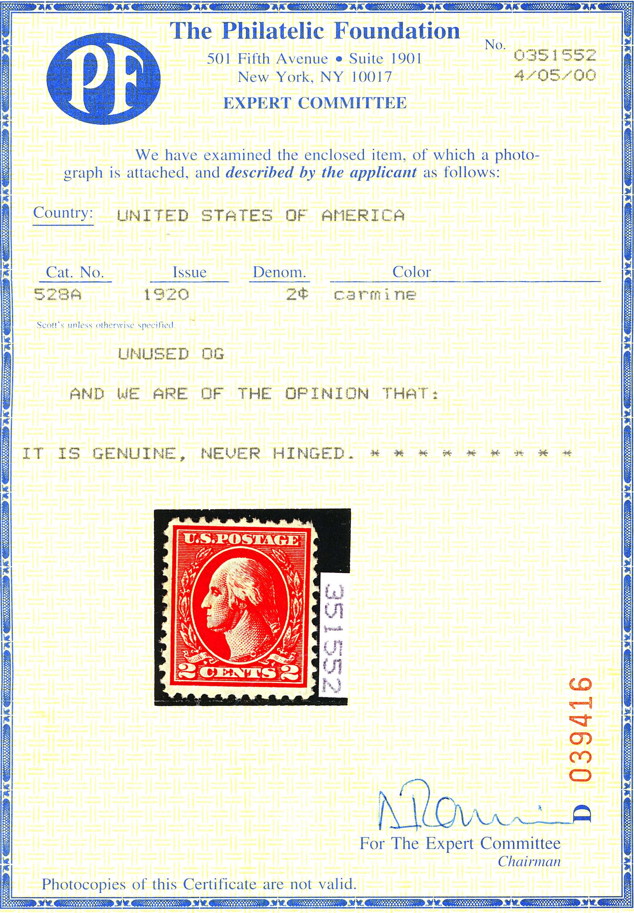 U.S. #528A MINT OG NH PF CertSeller Information