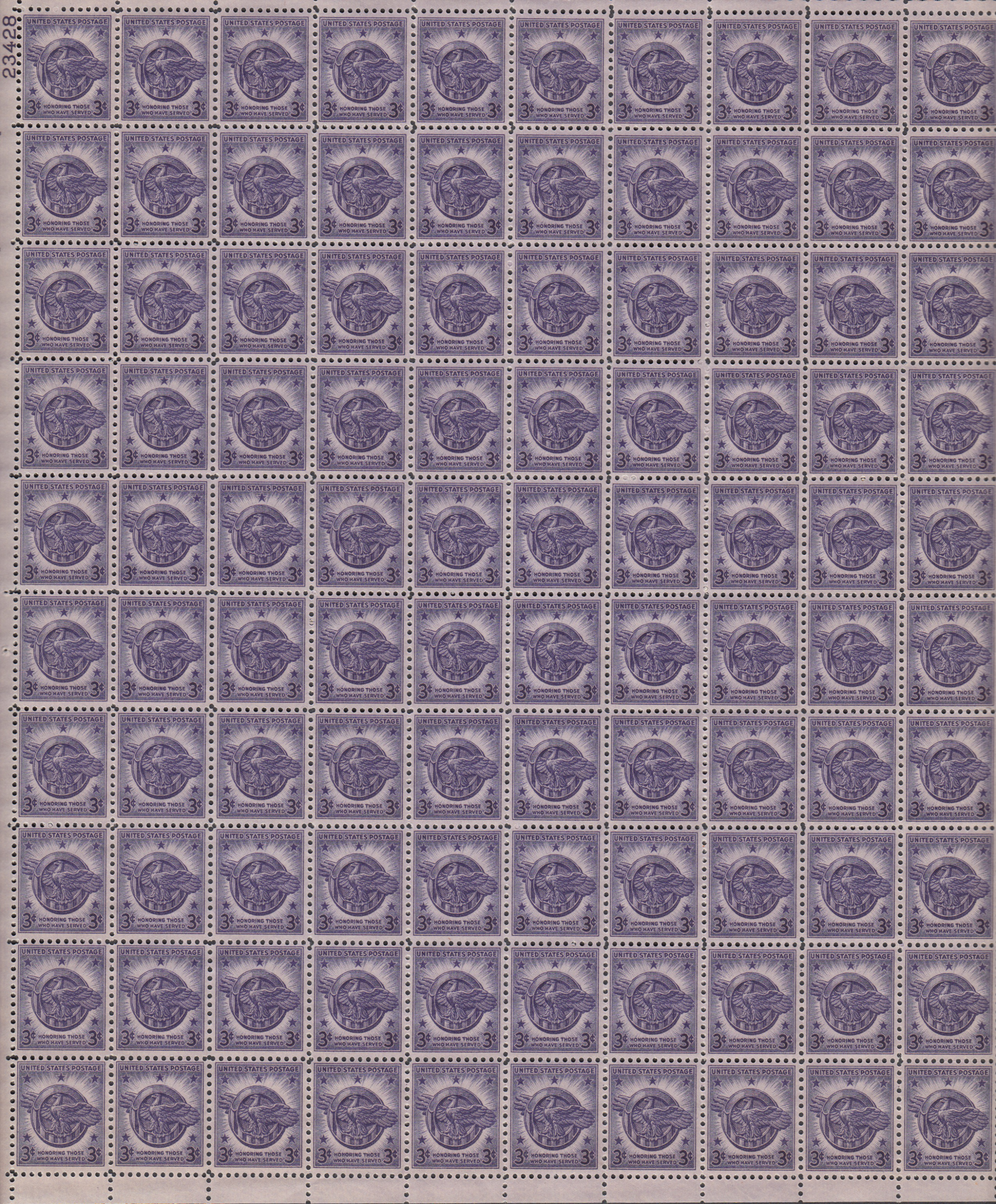 3c Honorable Discharge sc # 940 full sheet of 100 MNH.- I have duplicates of many of the sheets I am listing so photo may not be actual one sent