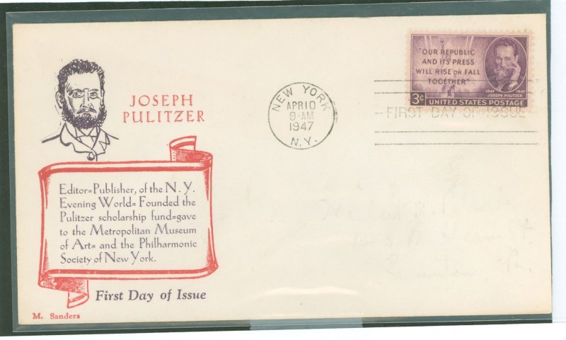 US 946 Joseph Pulitzer Michael Sanders, 1st day cachet erased address