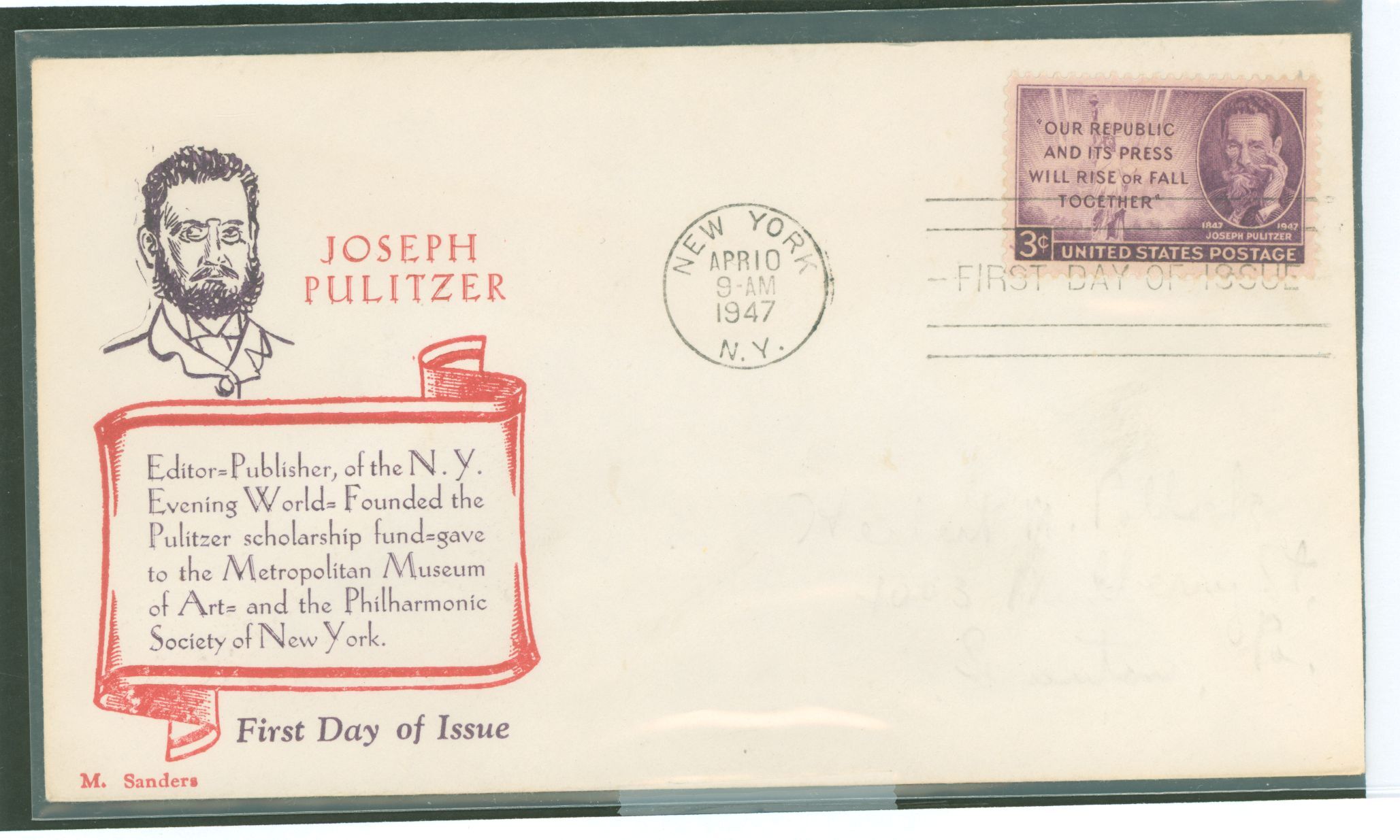 Joseph Pulitzer Michael Sanders, 1st day cachet erased address APS Stamp Id: 501937857 APS Seller Id: 695699 Hinge Type: Not Specified
