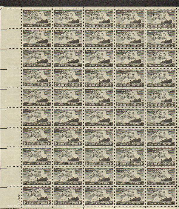 US #956 Mint Sheet Four Chaplains The image shown may not be the actual sheet you receive. Sheets will not be folded. Minor perf separations in the selvedge are normal and are not grounds for return. Centering wil ... Read More