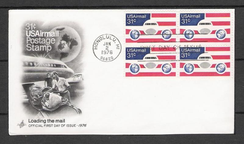 Welcome! United States - First Day Cover Catalogue #: C90 Cachet: Art Craft Date: January 2,1976 City/State: Honolulu, HI Description: 31c Plane, Globes & Flag - Block of 4 Condition: VG - Clean, ... Read More