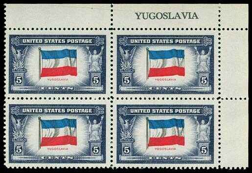 U.S. PLATE BLOCKS, 917cMint, 5c Yugoslavia, reverse printing of only dark rose over black, the blue is printed normal, T.R. inscription block of four, OG, NH, Superb Gem