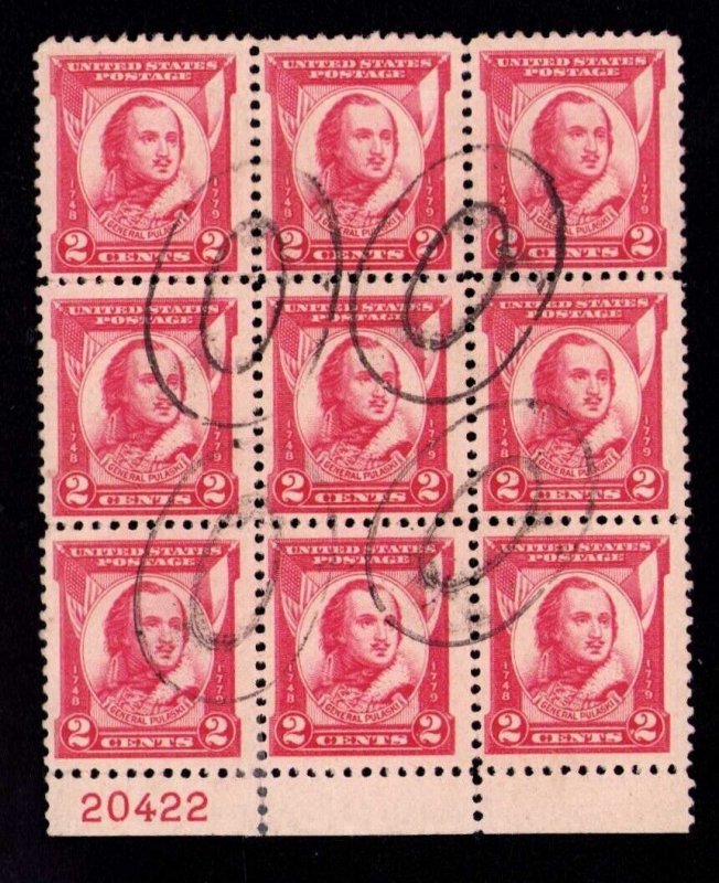 US Sc #690, Block of 9 With Plate # Tab 1931 General Pulaski 2c Used