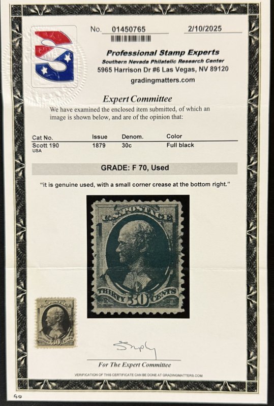 US Scott #190 used with PSE cert