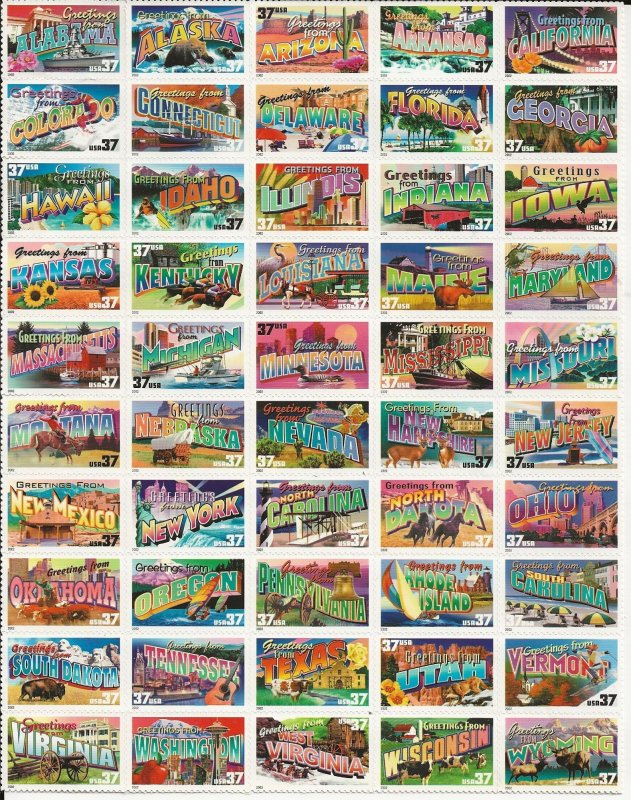 US ^ Scott # 3745A - MHGreetings From America - Sheet of 50 37 cent State Stamps