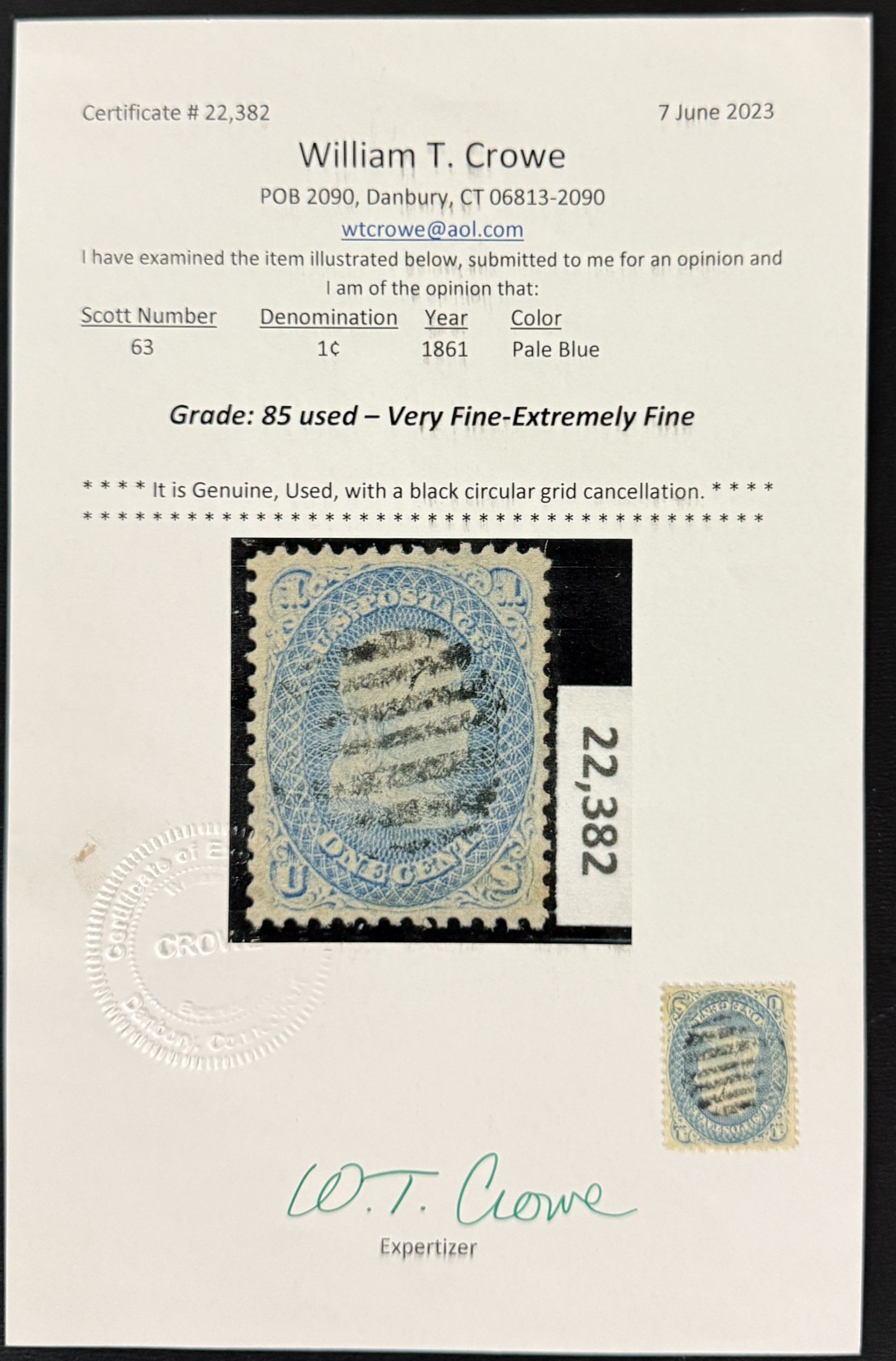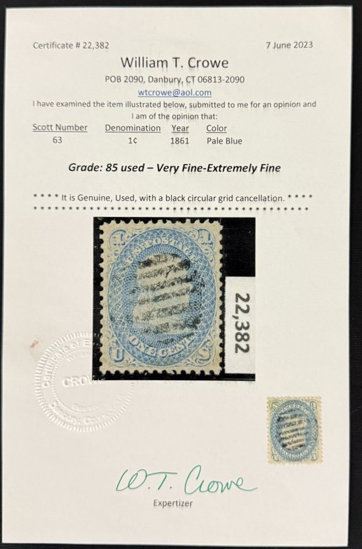 US Scott #63 used with William Crowe cert