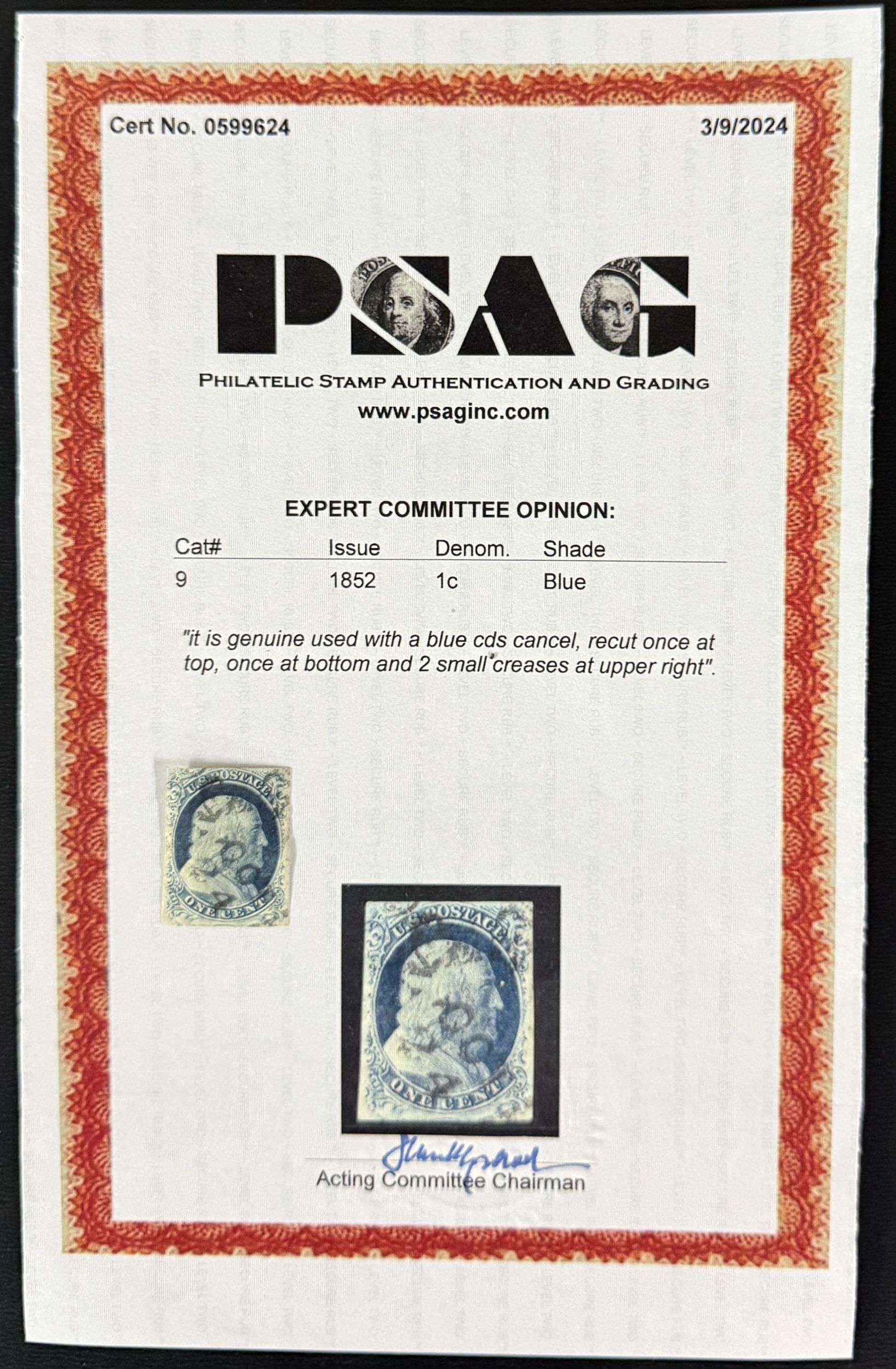 US Scott #9 used with PSAG cert