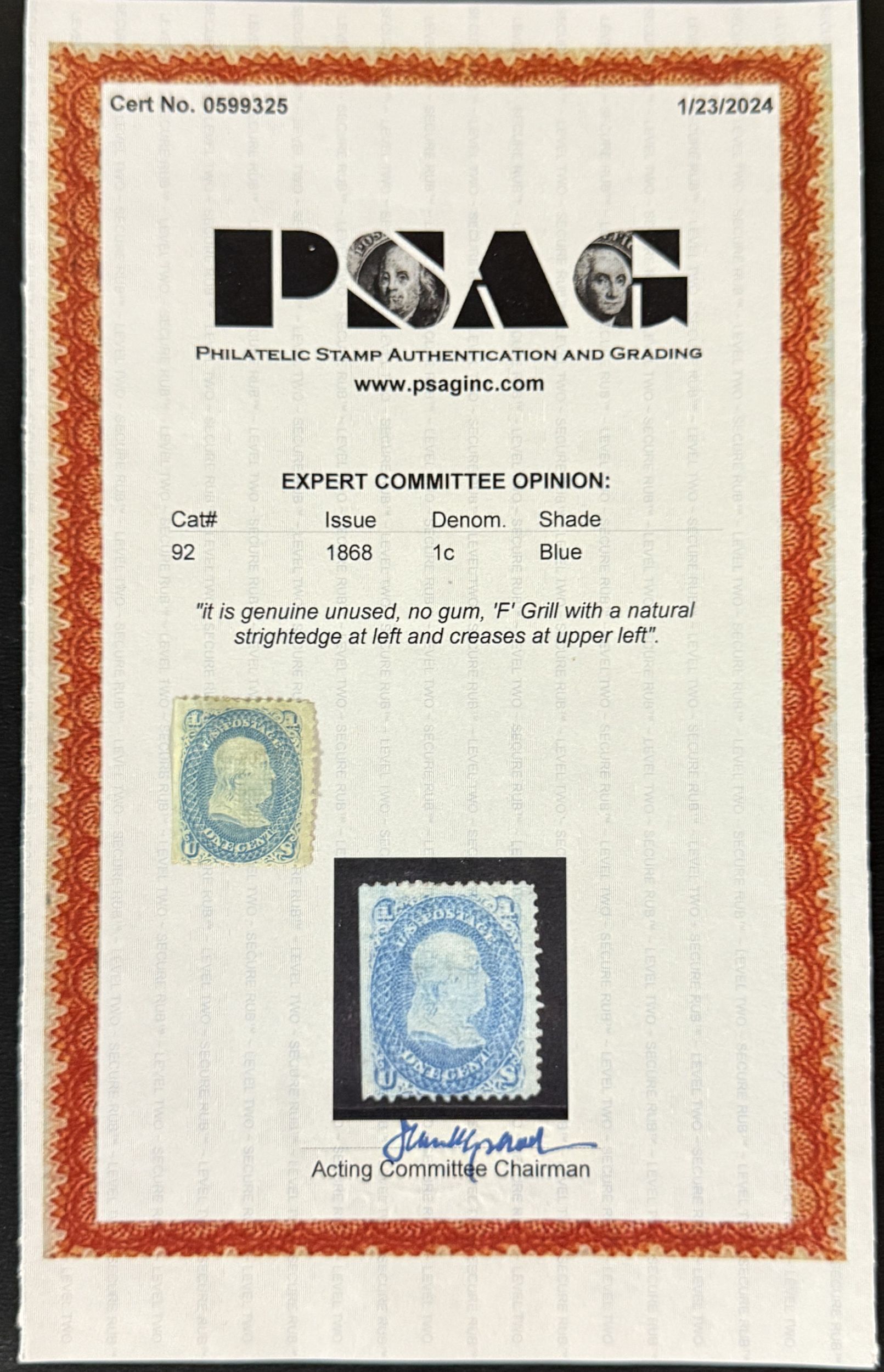 US Scott #92 Used with PSAG cert