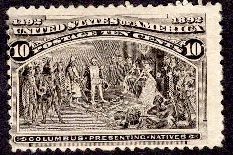 Here we have Columbus presenting natives to the King and Queen of Spain. We bet that was an interesting conversation.Faults: NO GUM, Perfs into design at left, perf faults