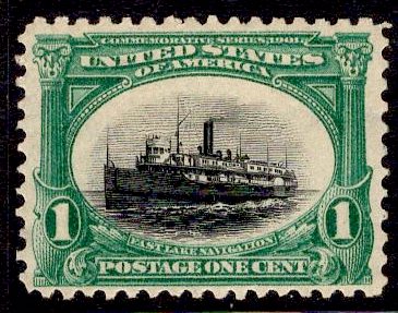 Boats, Trains and Automobiles (and a bridge) feature in the 1901 Pan-American Exposition Issue. Here we have the 1c Green and Black entitled "Fast Lake Navigation" which seems fun and dangerous.the Faults: None Apparent