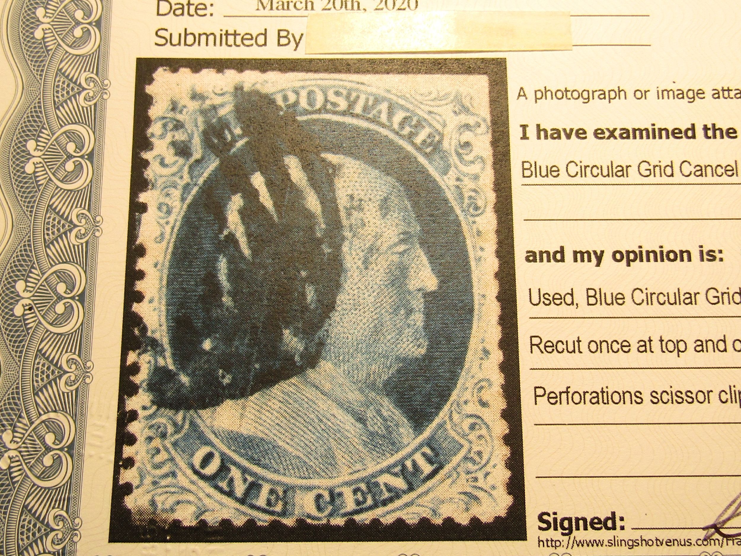 US Stamp, Scott #23 Used, SCV $575.00, w/Certificate, Clipped at top and right, Type IV, Blue Circular Grid Cancel, A Relief from Plate 1Late, Position 37L1L, Recut once at top and once at bottom variety, (113 on plate), very nice center,Bids History