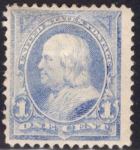 Enter the Triangles--the first of the triangle Bureau Issues features the 1 cent Ultramarine version of Mr. Ben Franklin. Also, the color "Ultramarine" just sounds cool.Faults: Faded and scuffed, heavy hinge, paper remnant stuck on back at bottom right