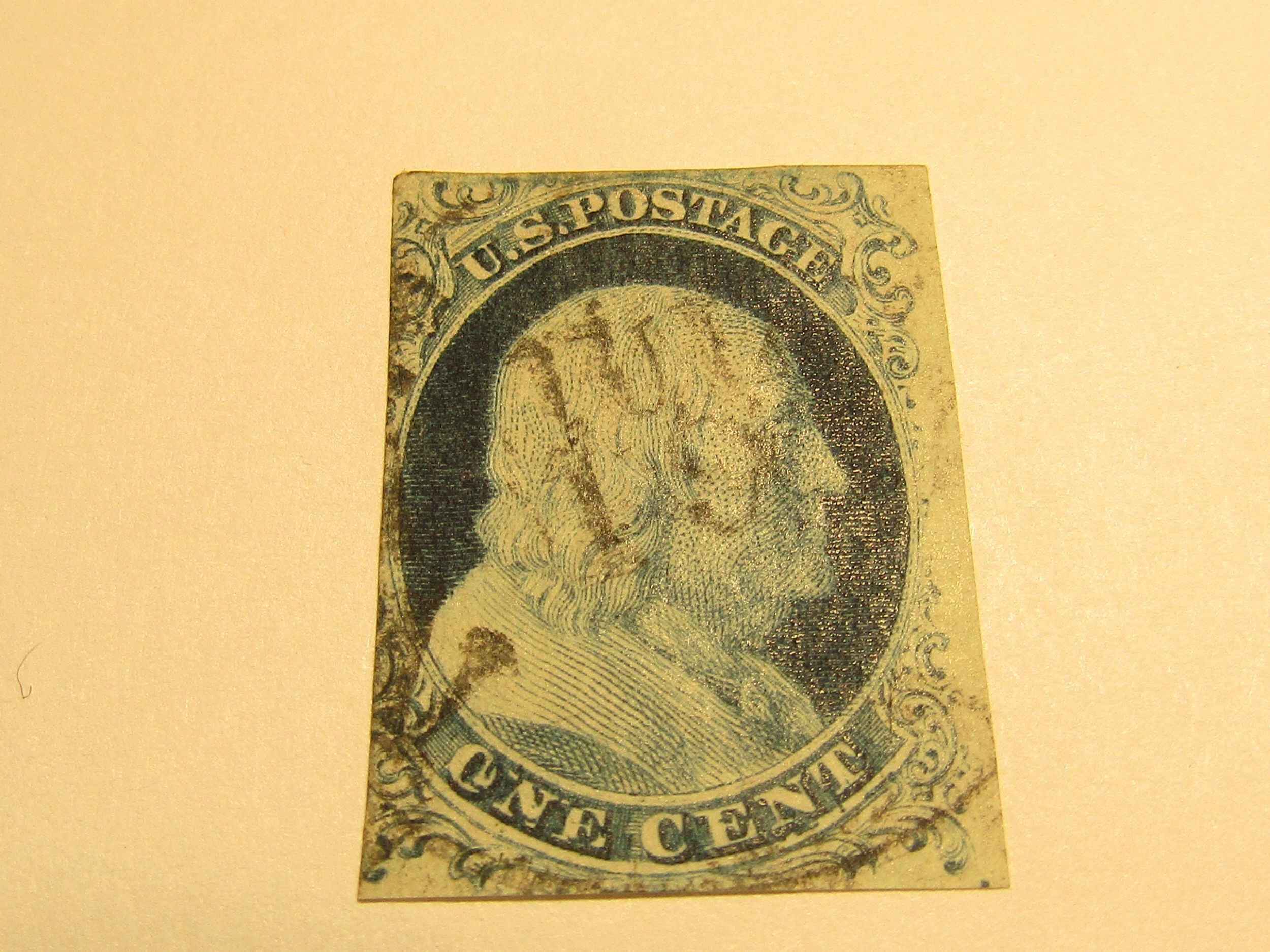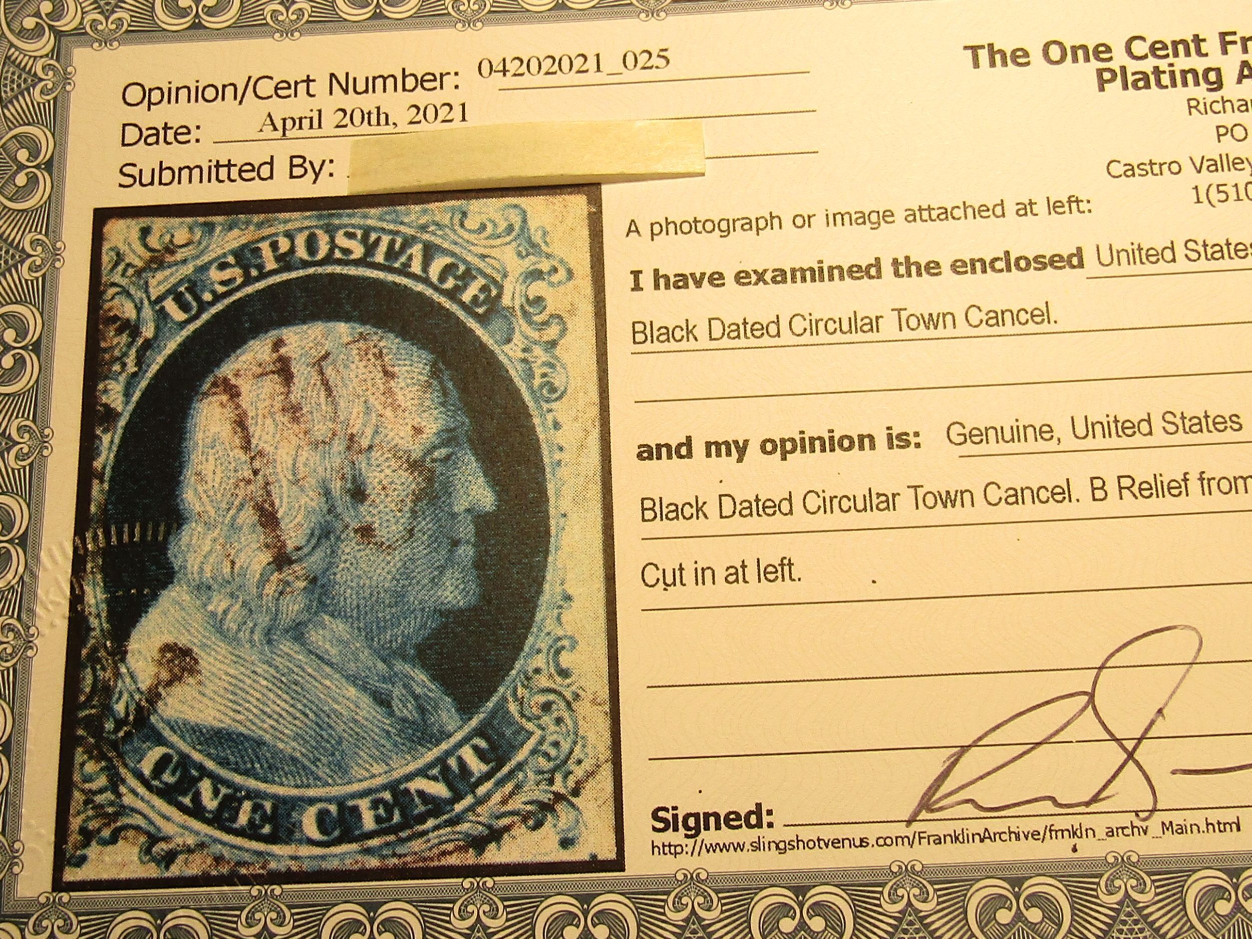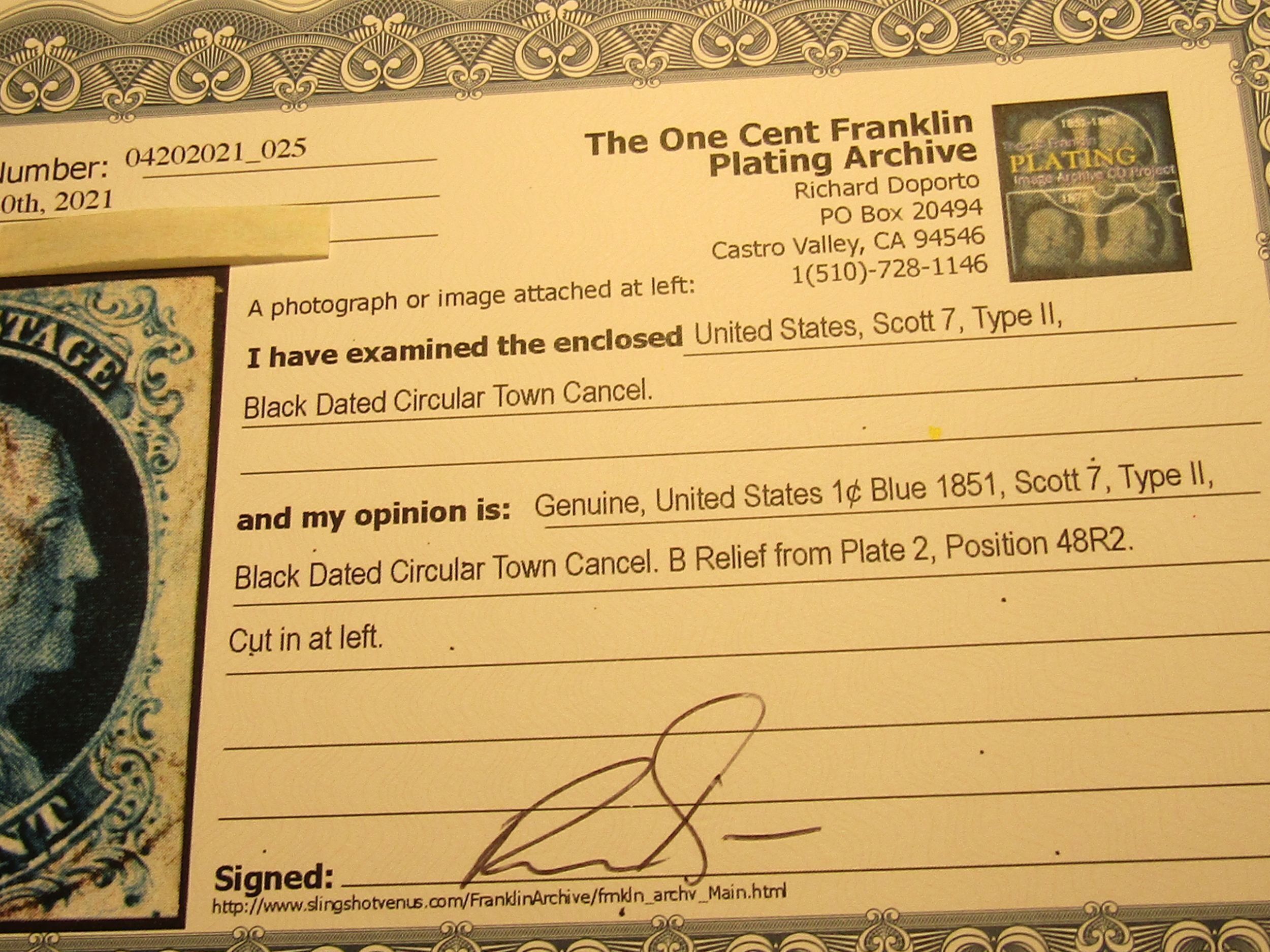 US Stamps Scott #7, Used, SCV = $150.00 for: B Relief from PLATE 2, Cut in at Left, Position 48R2, Black Dated Circular Town Cancel, with Richard Doporto Certificate,