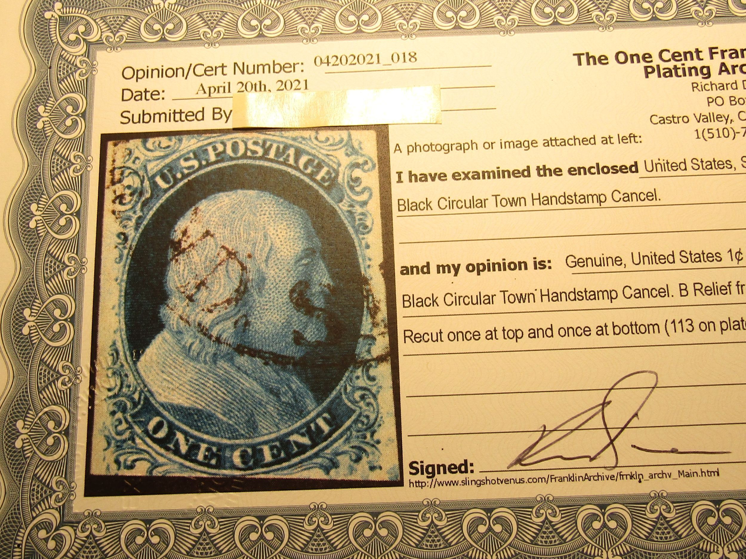 US Stamps, Scott # 9 used, Black Circular Town Cancel, with Richard Doporto Certificate, Type IV 1851, B Relief from Plate 1Late, Position 85L1L Recut once at top and once at bottom ( 113 on plate ),Bids History