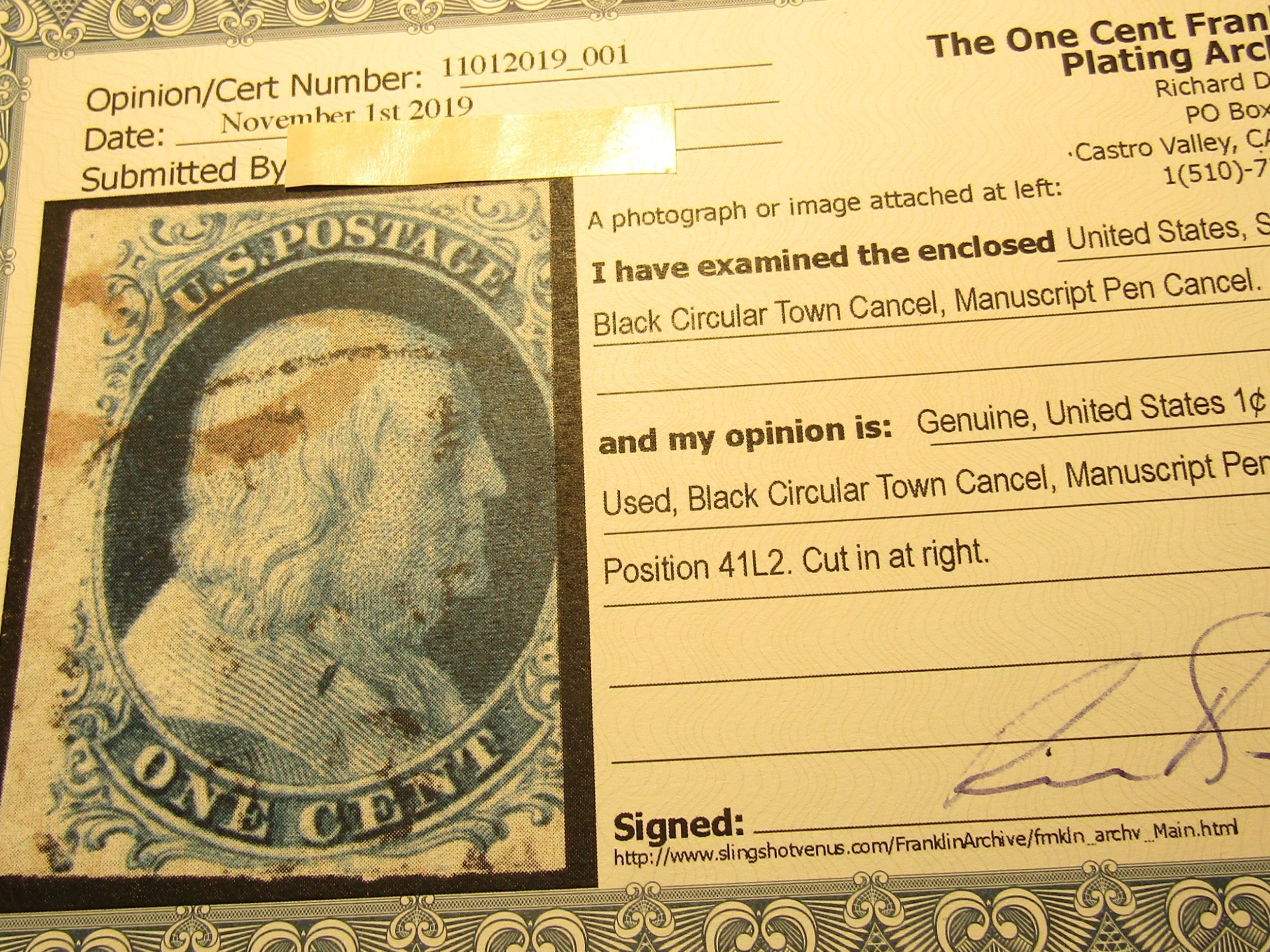 US Stamps- Scott # 7 - Used, Franklin 1851 Type II, Black Circular Town Cancel and Manuscript Pen Cancel, Cut in at Right, B Relief from Plate 2 Position 41L2, with Richard Doporto Certificate, SCV = $150.00,Bids History