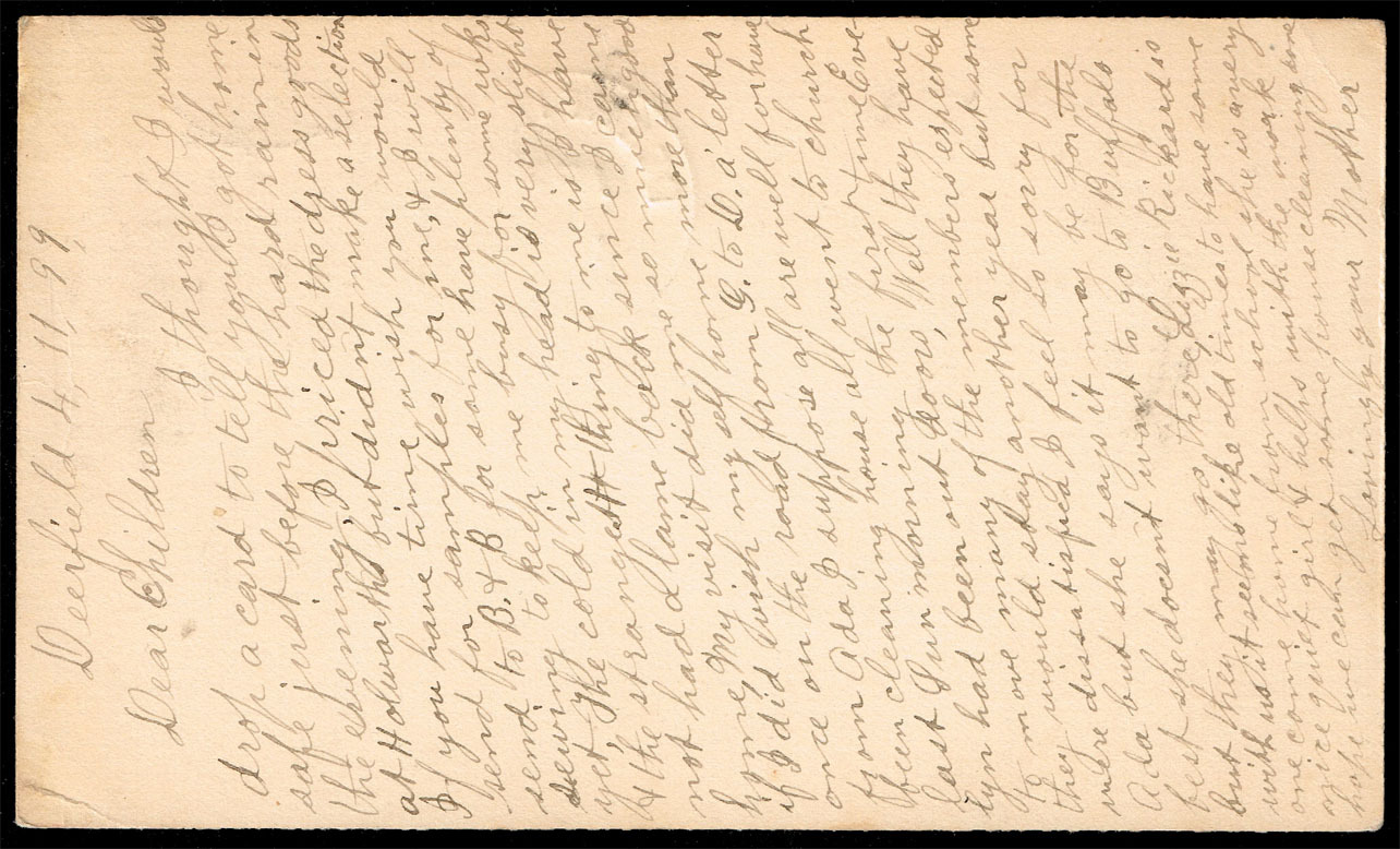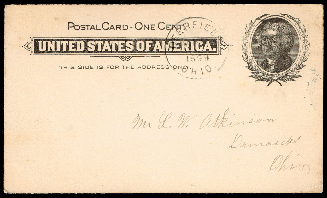 Postal Card #UX14 from Deerfield, OH to Damascus, OH, postmarked April, 1899.Postal Card - Buff - Large Wreath and Name