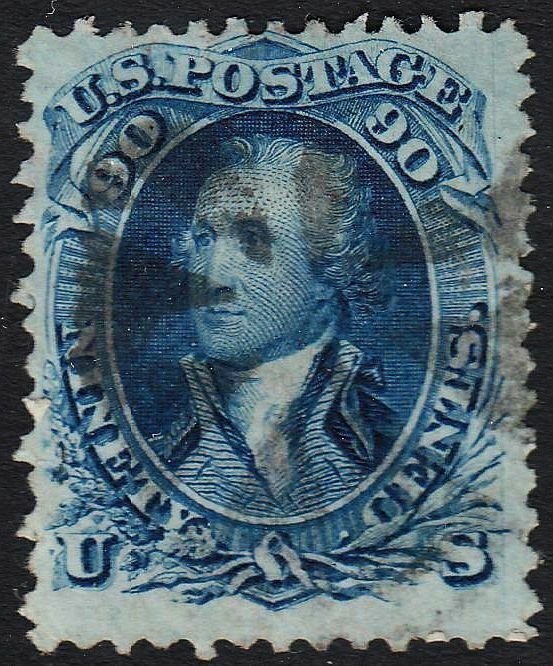 Intense bright color, printed on bright white paper, hinged, lite paper wrinkling at hinge area, modest cancel, normal cragy perfs at left margin, two bent perfs at bottom since straightened, this is a pleasing fresh example of the dark blue, 72b.