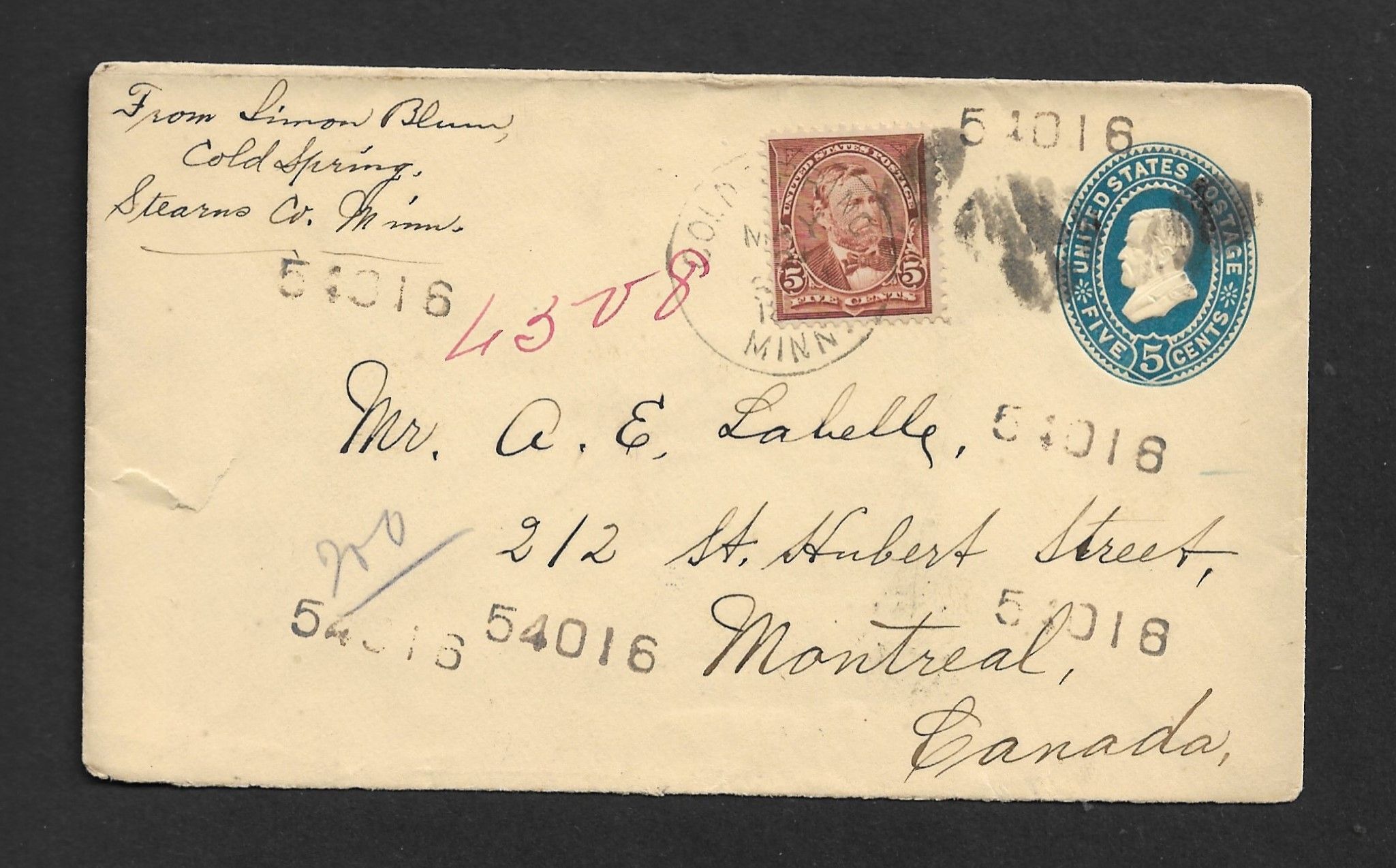 USA 1896COVER FROM COLD SPRING, MINNESOTA > MONTREAL, CANADA WITH INTRANSIT PMKS