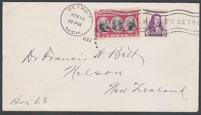 USA 1933 cover Detroit to New Zealand - 5c rate.............................J873