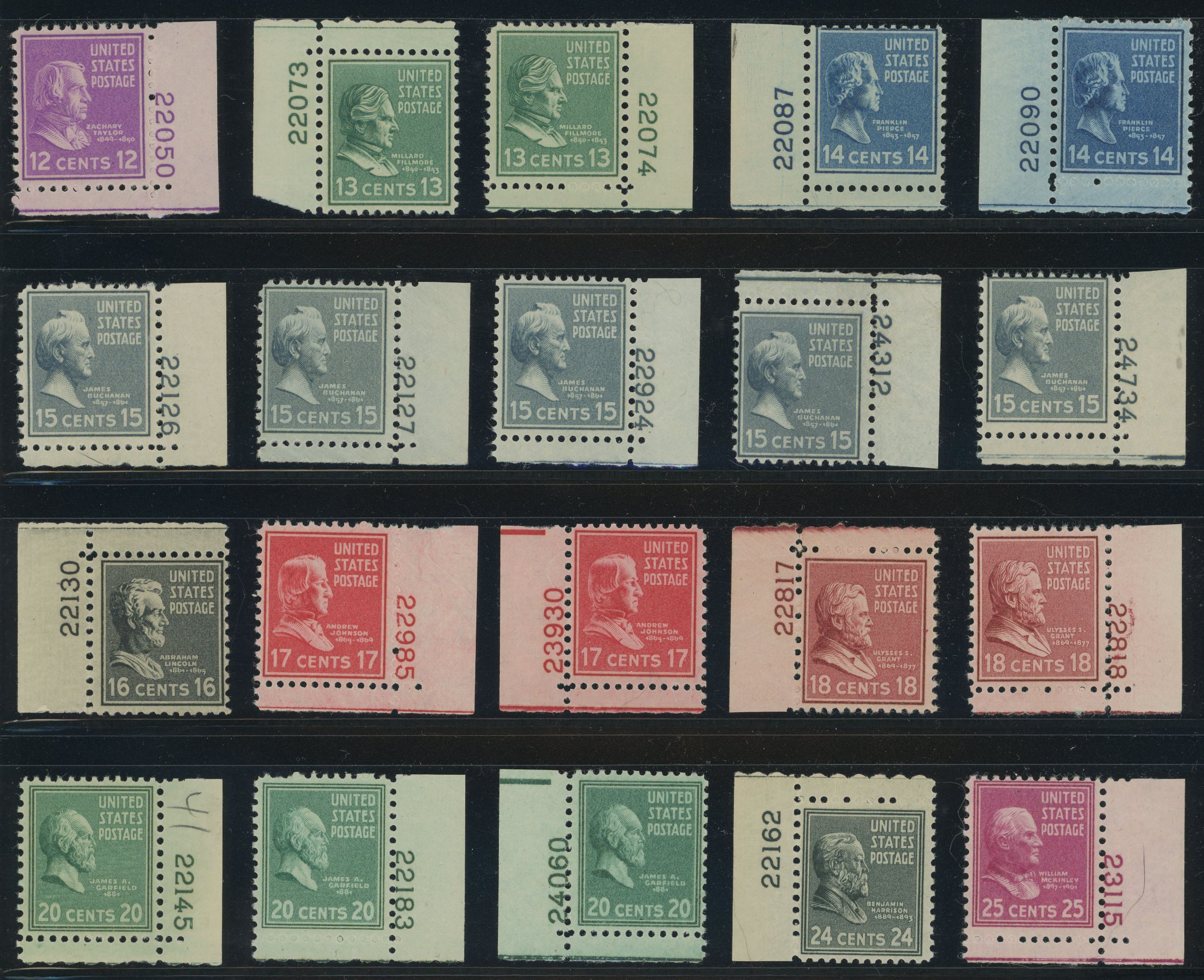 This lot consists of 55 different plate # singles from the Presidential Issue of 1938. Runs from the half cent up to the 25 cent issue. These are a mix of hinged and never hinged. May be occasional minor fault. IMP ... Read More