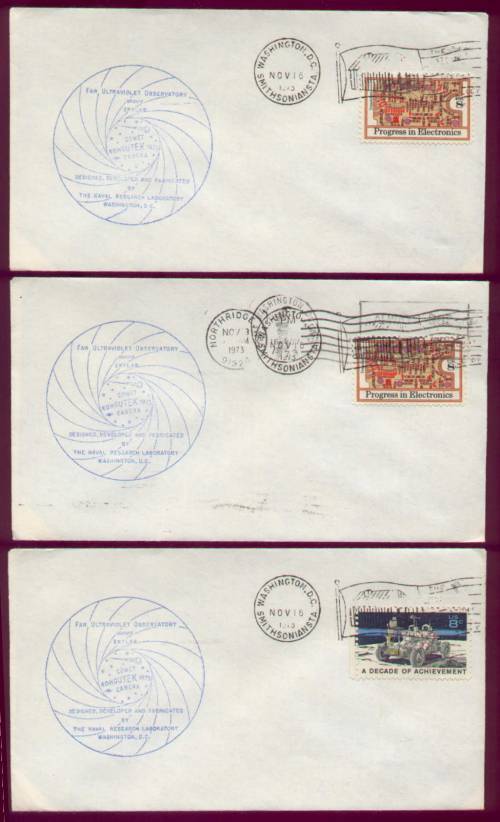 A nice set of 3 astronomy-related covers for the Far Ultraviolet Explorer mission, flown on Skylab. Washington DC, Smithsonian Station, 11-16-1973. One cover was cancelled 3 times, plus one on the back. These can't be too common.Seller Information