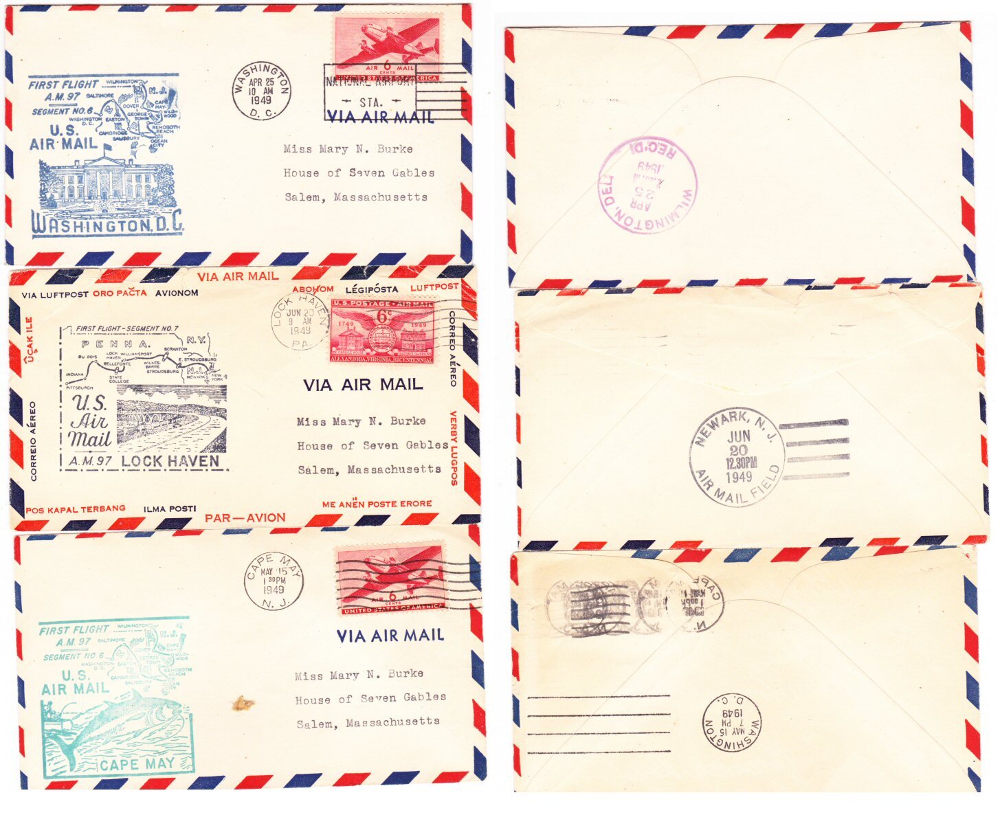 3 commemorative covers from the USA. First Flight AM97 - 1949. Addressed to House of Seven Gables, Salem, MA. Unusual.