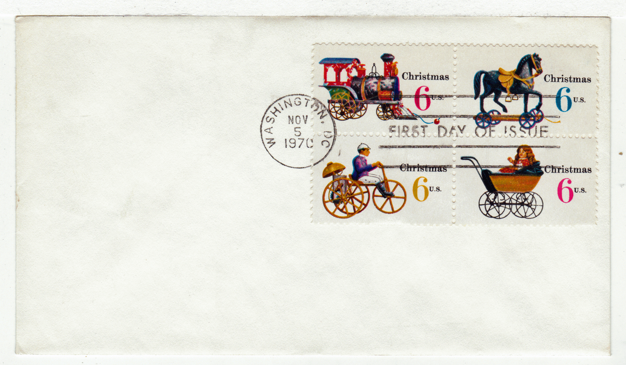 First Day Cover Scott # 1418B (# 1415 - # 1418) - Christmas Toys 1970 - Se-Tenant Block of Four, November 5, 1970, Mailed from Washington, DC.Seller Information
