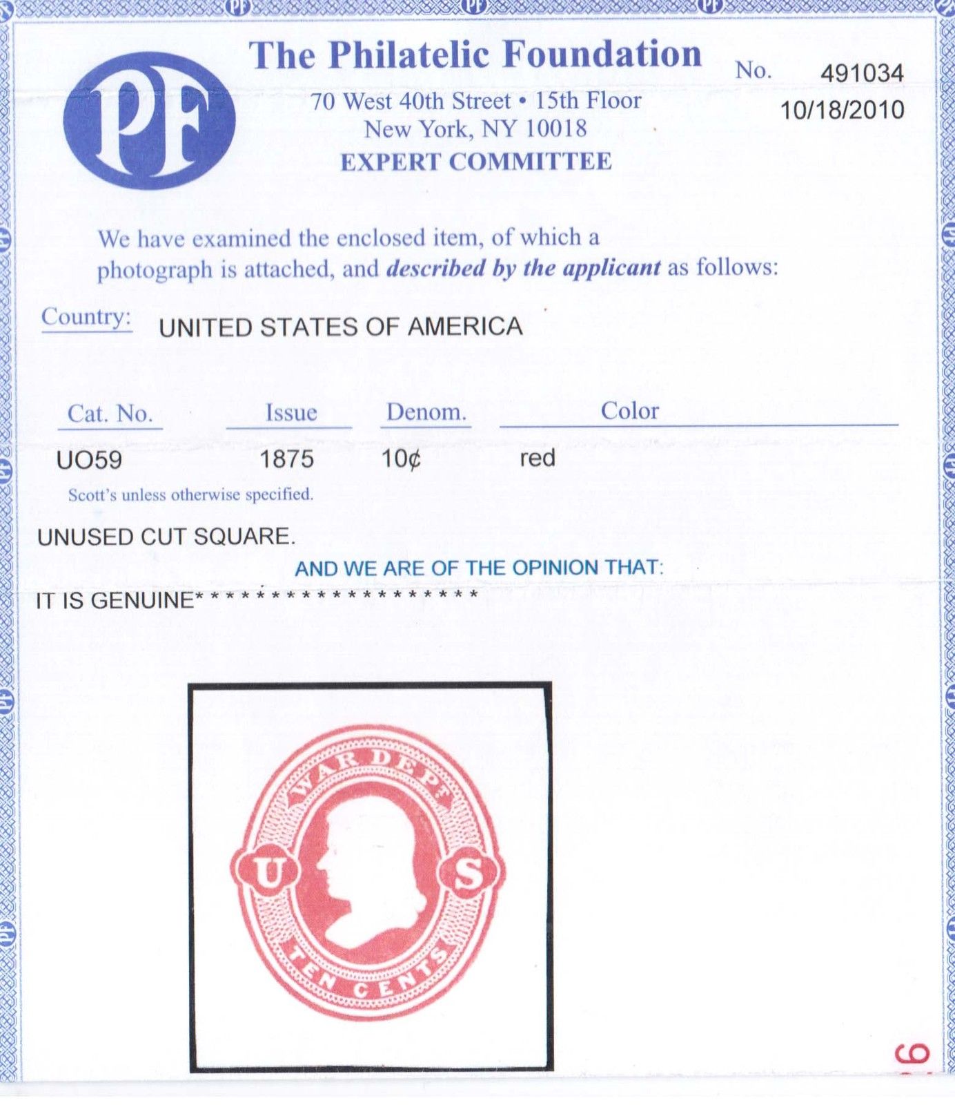 USA #UO59 VERY FINE MINT, WITH CERTIFICATE.Canadian residents will be charged appropriate taxes for their province.