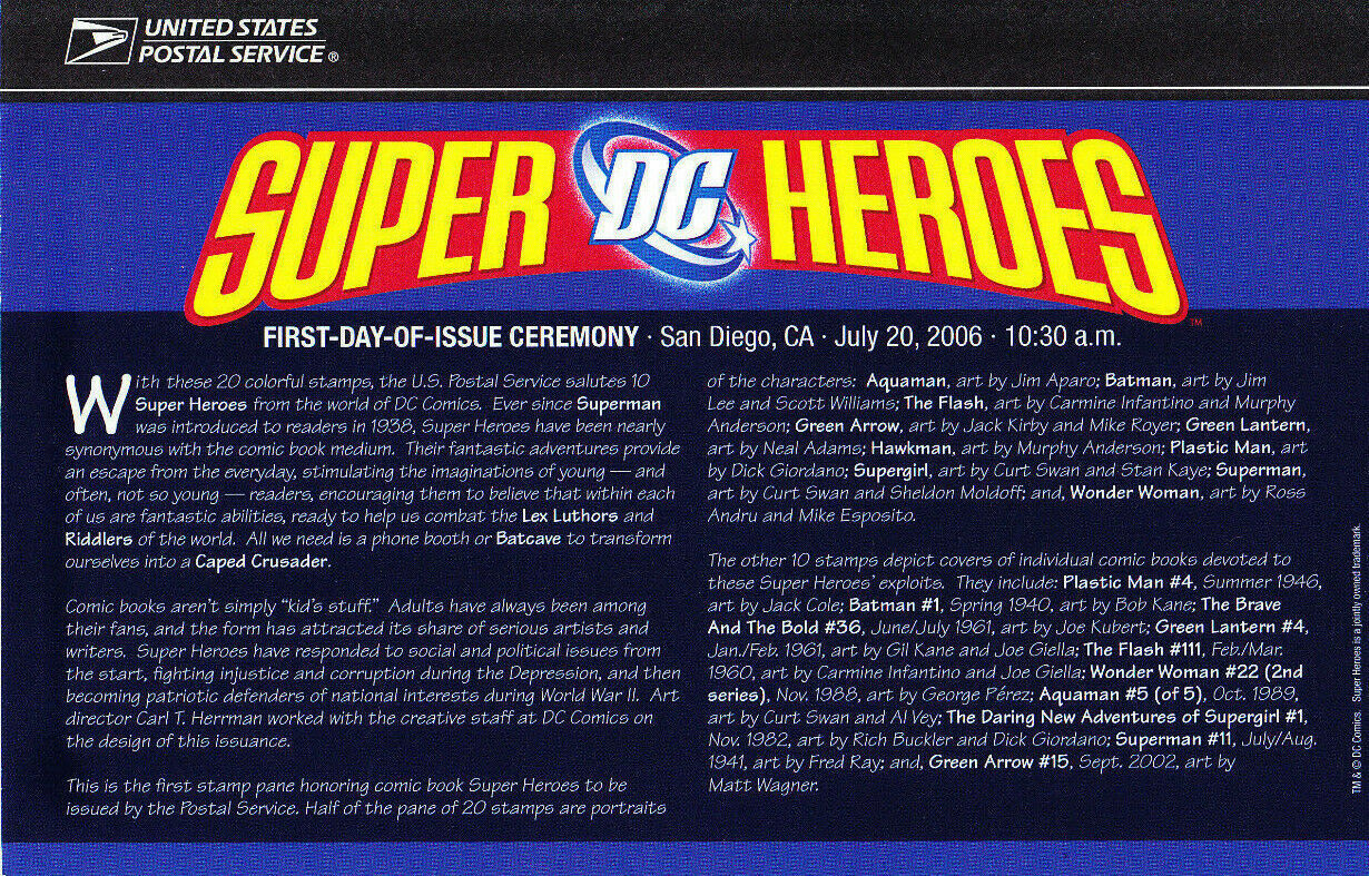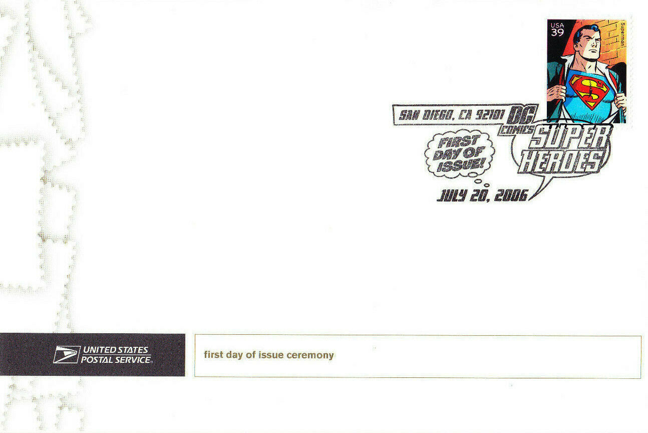 Condition:small flaw on top edge of envelope - does not show in scanUSPS First Day of Issue Ceremony Program for the dedication of Scott #4084a 39c Superman commemorative stamp, FDOI, July 20, 2006, San Diego, California. Program measures 9" x 6".Sales History