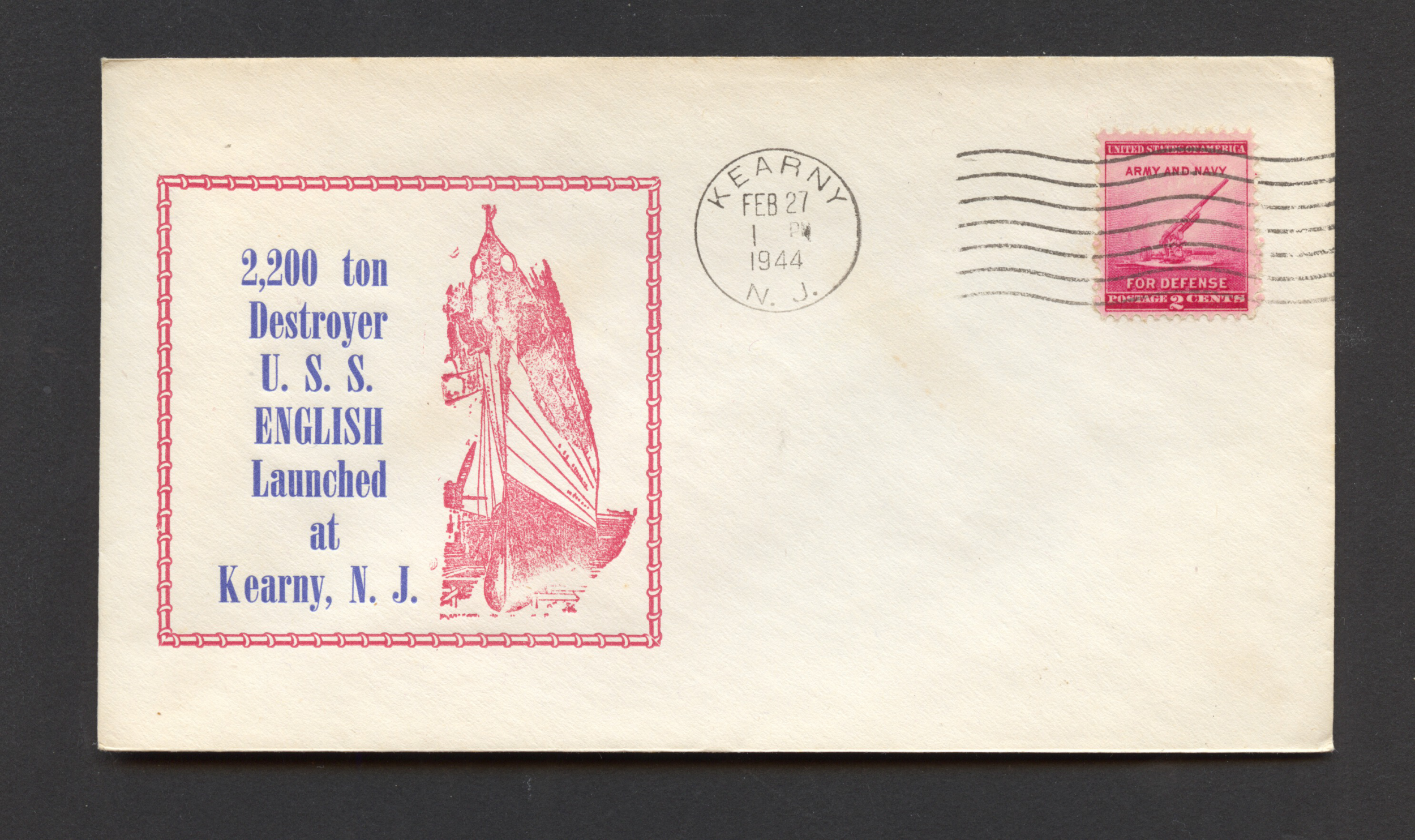 A printed cacheted cover hand cancelled at Kearny NJ on Feb 27, 1944 for the launch of the US Navy destroyer USS ENGLISH DD-696.The rear flap is not sealed.There is toning on the gum lines on the back.