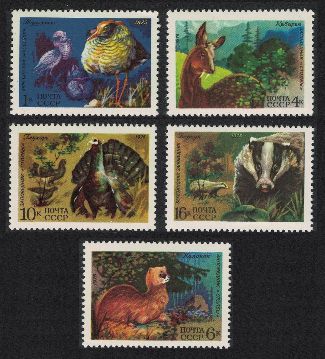 50th Anniversary of Berezinsky and Stolby Nature Reserves Condition: MINT NEVER HINGED Catalogue Numeration: Stanley Gibbons No.: 4433-4437 "