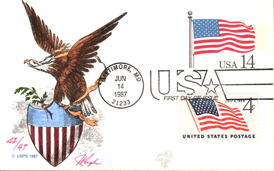 #UX117 United States Flag first day cover by Julian and Sharon Pugh. This cover is #42 of 47. A copy of Pugh's information sheet is included. Postmark State: MD City: Baltimore Year: 1987 Month: 6 Day: 14Seller Information