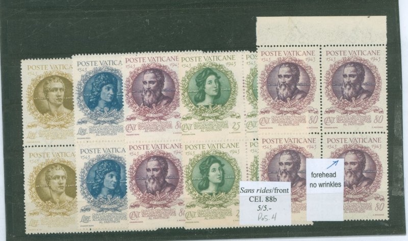 1944 4th Centenary Pantheon, set of blocks of 4: one stamp with var. plate flaw Sc. 90var: no wrinkle on forehead (CEI=5.-Eu.)APS Stamp Id: 501798502