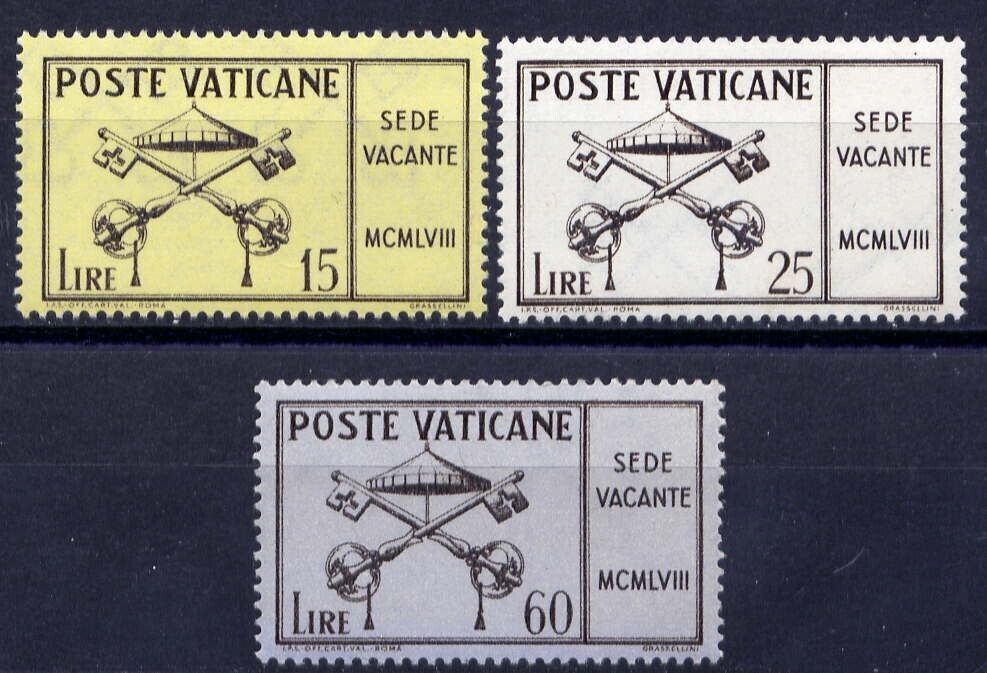 Grade: VF/XF (Very Fine/Extremely Fine)VATICAN Sc#247-9 1958 Interregnum Issue MNHThe photo is a stock photo. However, we guarantee our quality or your money back.Shipping Cost: (we combine items, BUT PLEASE WAIT FOR THE COMBINED INVOICE BEFORE MAKING THE PAYMENT.)Domestic: US buyer pays $1.50 for the first item, extra $0.10 for each extra item. Register mail available at EXTRA $19 each shipment. Register mail mandatory for shipment $300 or over.Overseas: Overseas buyer pays $3.00 for the first item, extra $0.20 for each extra item. Register mail available at EXTRA $22 each shipment. Register mail mandatory for shipment $100 or over.
