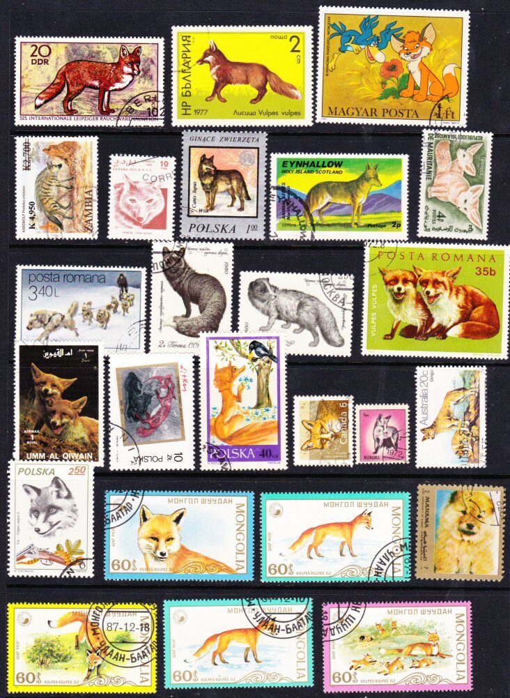 A batch of stamps showing wild canines: mostly foxes, with a dingo and a few others.Seller Information