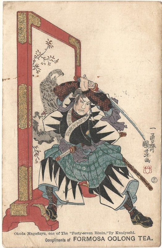 1911 divided back 1911 Japanese "FORMOSA OOLONG TEA" ADVERTISING POSTCARD 郵便はがき with a signed, colorful Art Print 芸術作品 of Okuda Magodayu, one of the "Forty-Seven Rönin" from the Japanese legendary story known as "Ch ... Read More