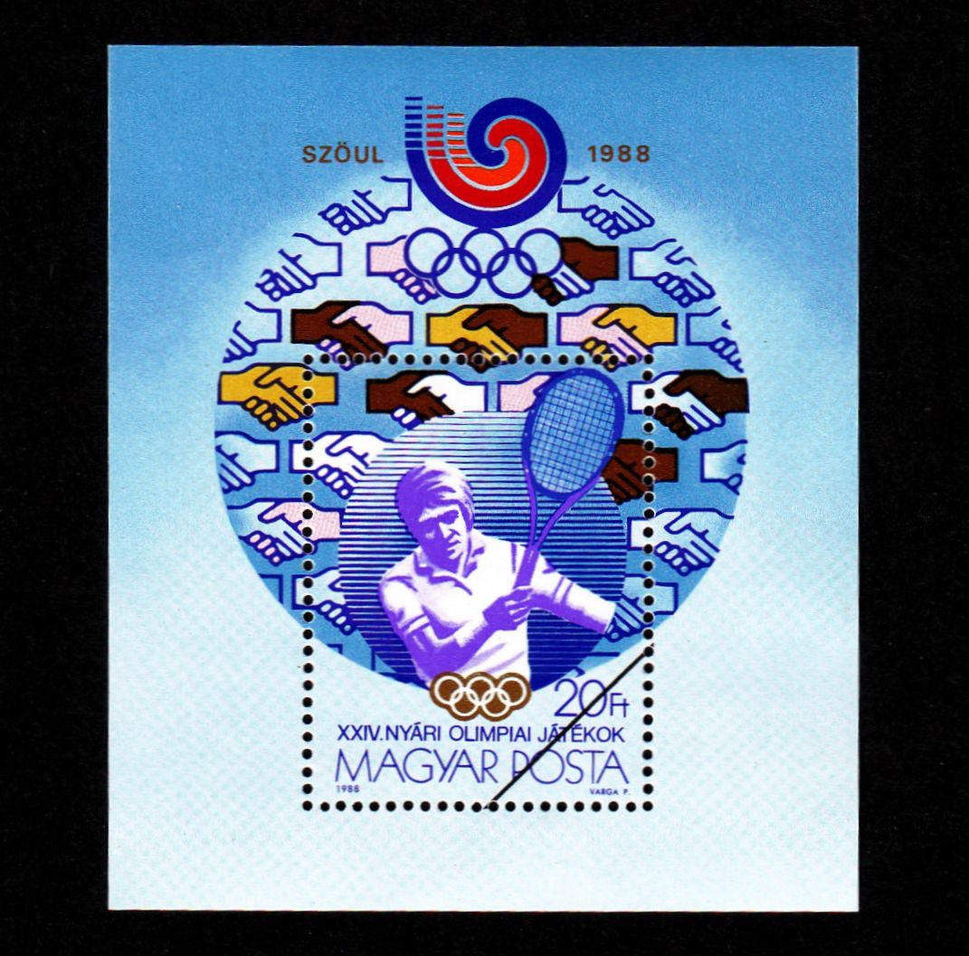 Mint never hinged souvenir sheet, Scott #3127, issued in 1988 for the Seoul Summer Olympic Games, featuring a tennis player in action. Specimen printing with line through denomination.Seller Information