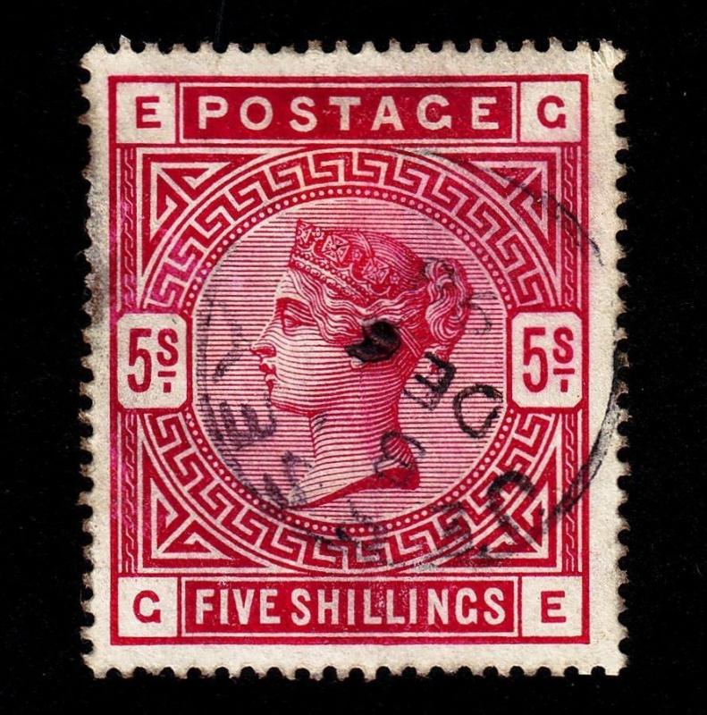 Sound used example of Scott #108, the 5 shilling carmine rose of 1884, with neat Jersey cancellation. Good centering and colour.